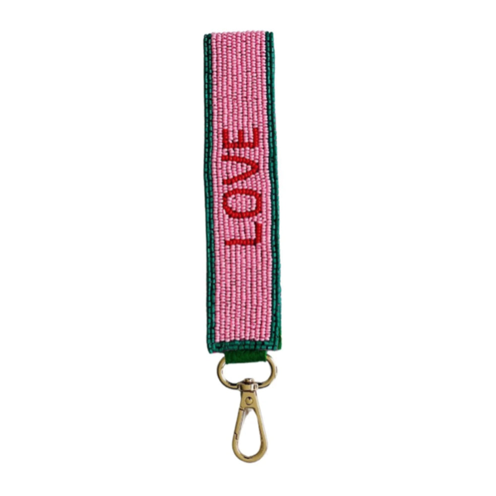 This keychain features gold hardware and a beaded wrist strap, with the word LOVE on one side, and AMORE on the other, in red. It's a fun accessory to clip on to those hard-to-find keys, or attach to your handbag bag as a bold bag charm.