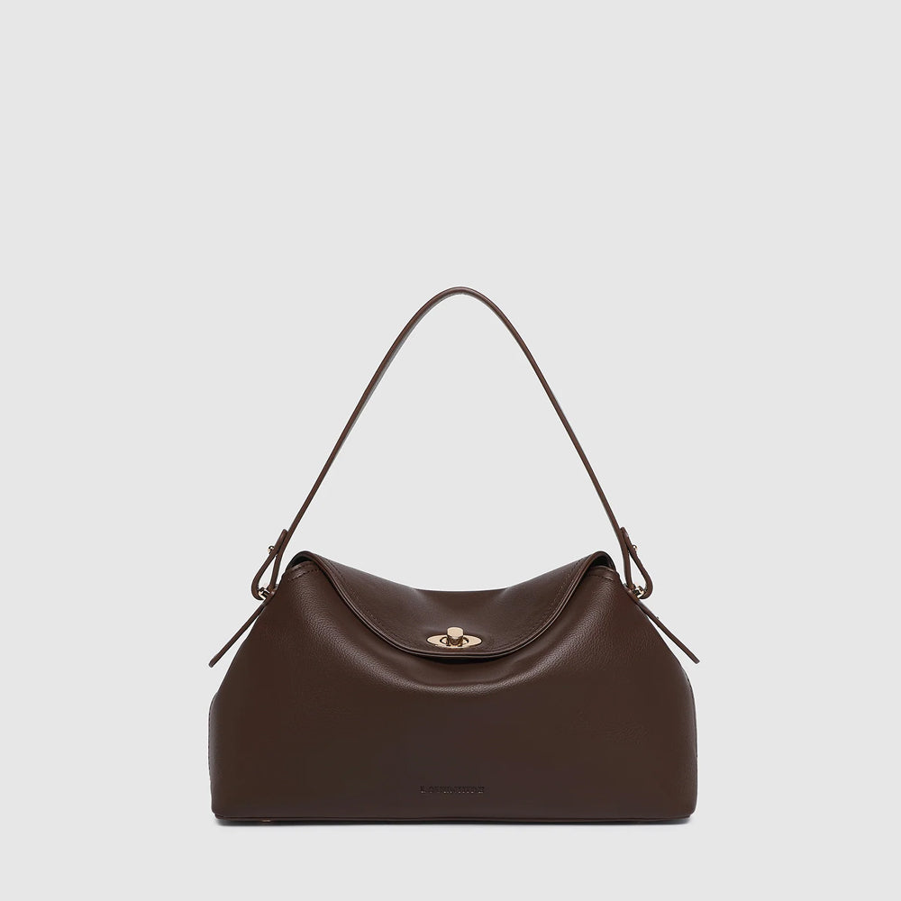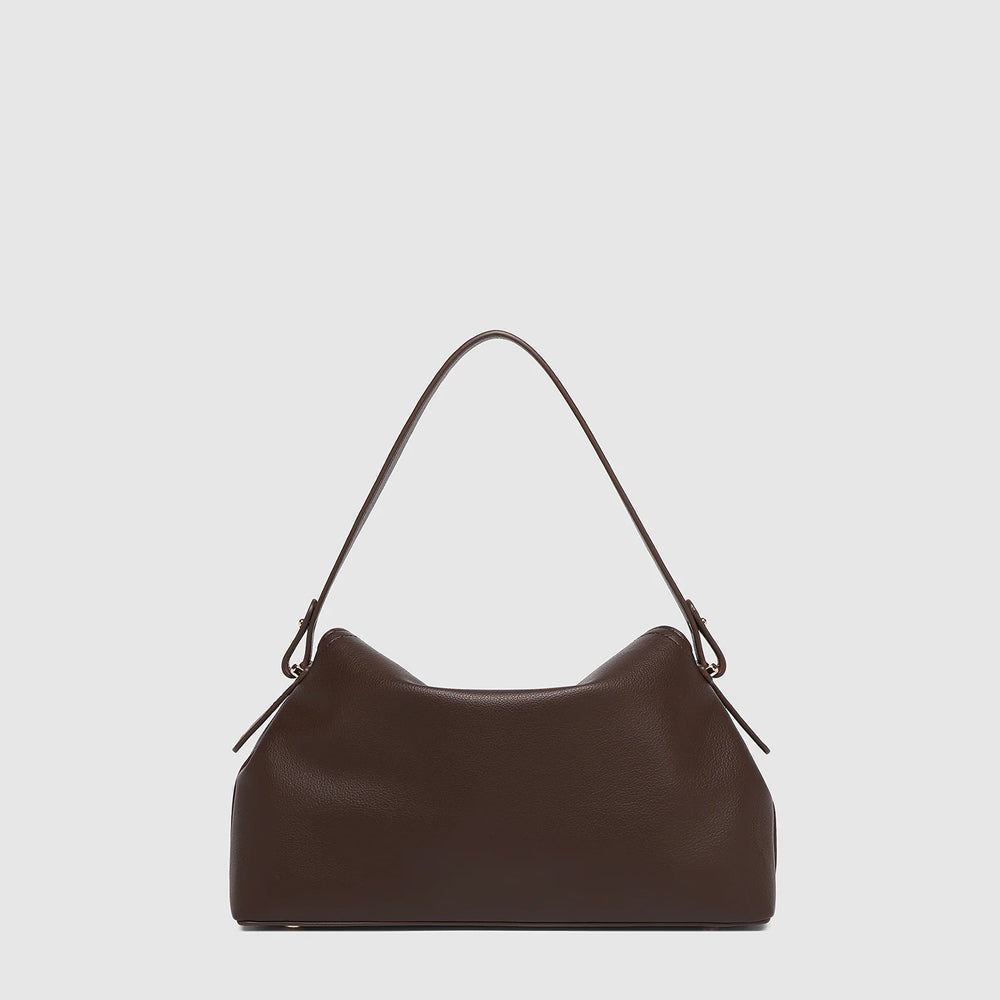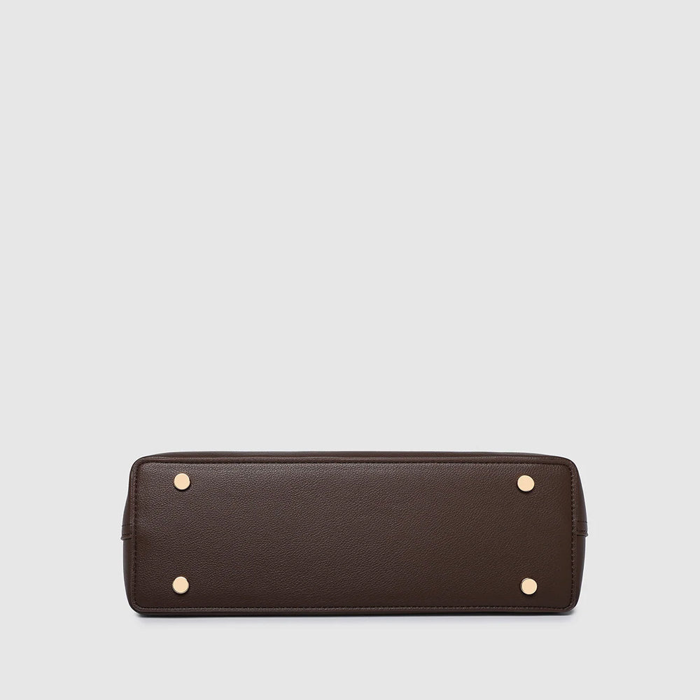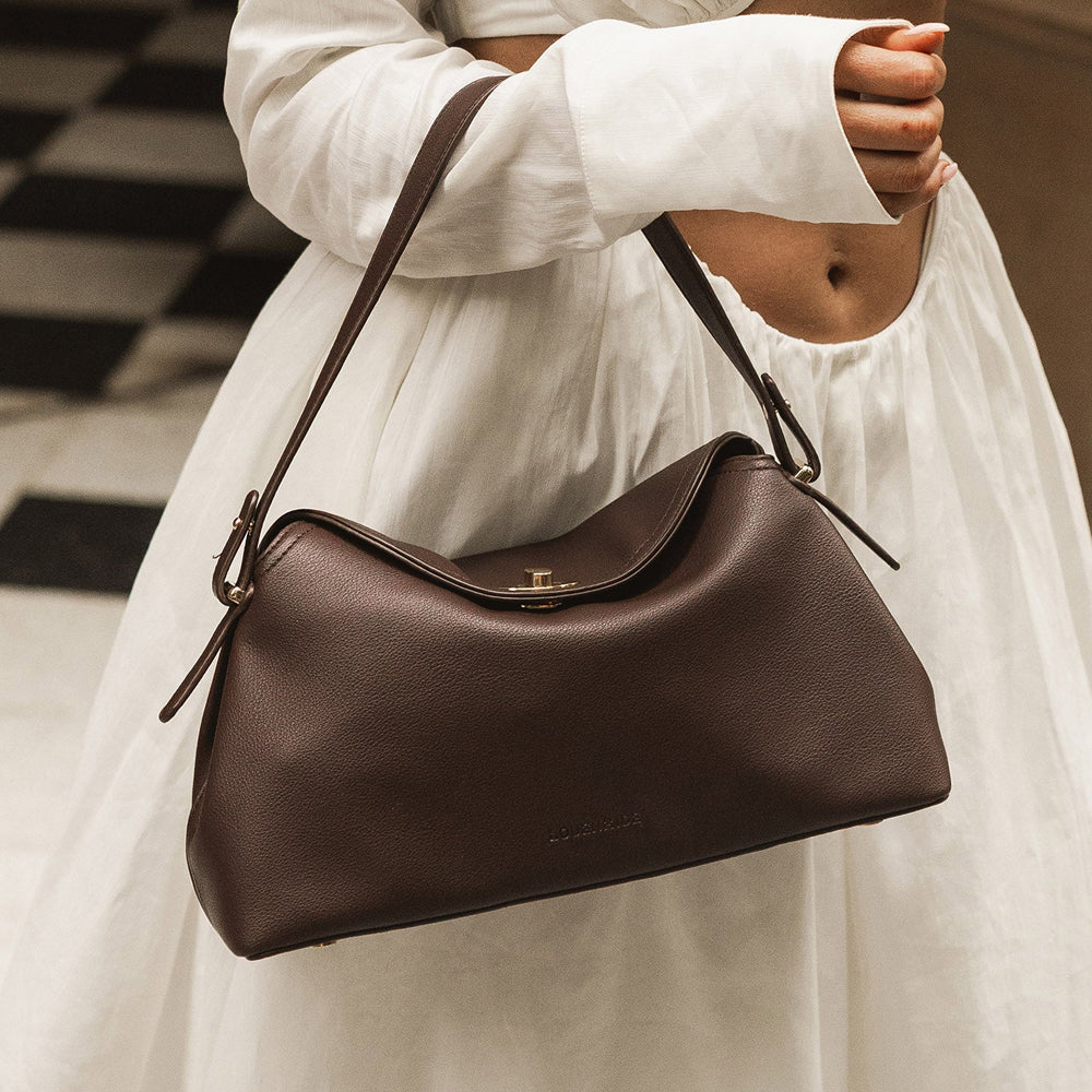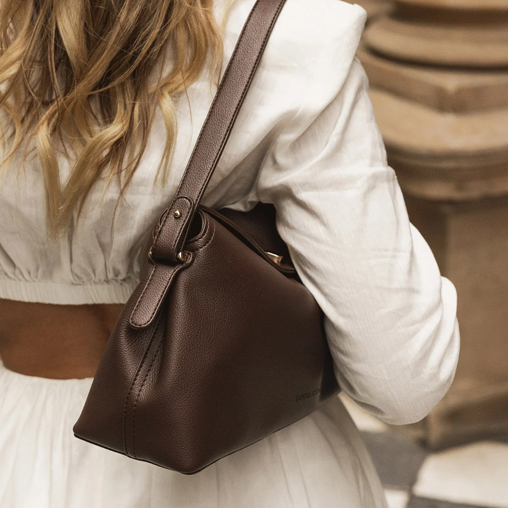 Chic and understated, the Nicole Chocolate Handbag brings a warm softness to everyday dressing. Crafted from smooth vegan leather and accented with light gold hardware, her clean lines and curved silhouette evoke an effortless Parisian charm.