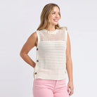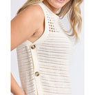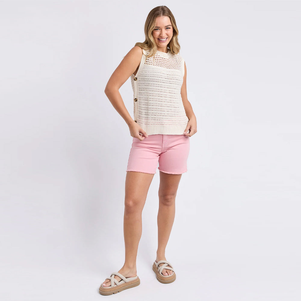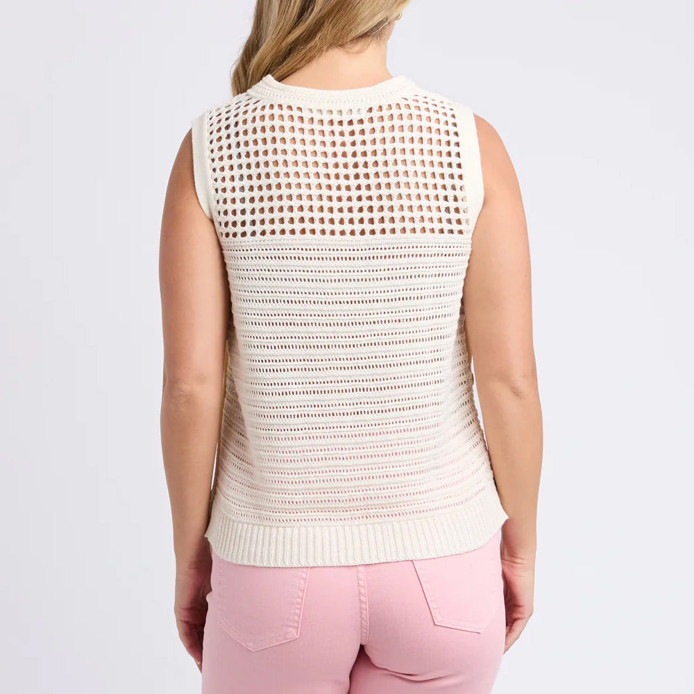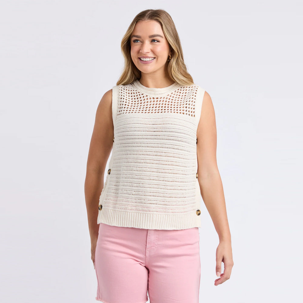 The Chilli Knit Top (Foxwood Clothing) is a fresh twist on layering with its open-stitch design, sleeveless cut and button detail at the sides. Light and airy, it is the perfect piece to throw over tanks, dresses or swimwear for an easy summer vibe.