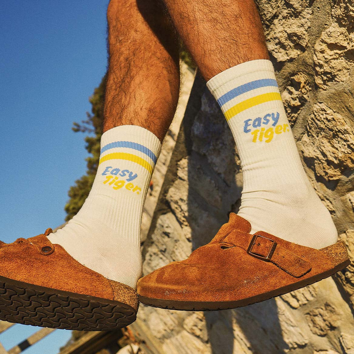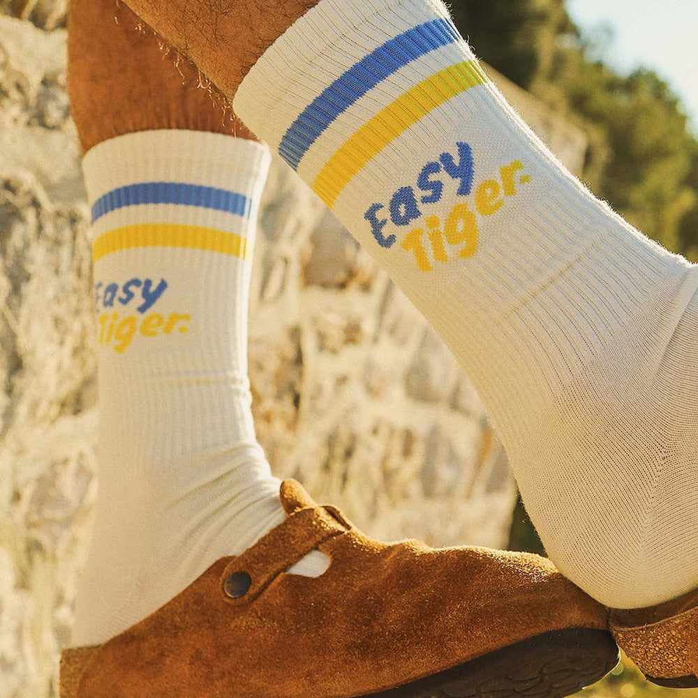 Kick back in style with the Easy Tiger Socks in Multi Stripe. Made from a soft, stretchy cotton blend, these lightweight, breathable socks feature playful knitted Aussie slang and a ribbed cuff for a secure fit. Retro-inspired, they add a cheeky pop of personality to your outfit, perfect for morning park runs to weekend hangs.
