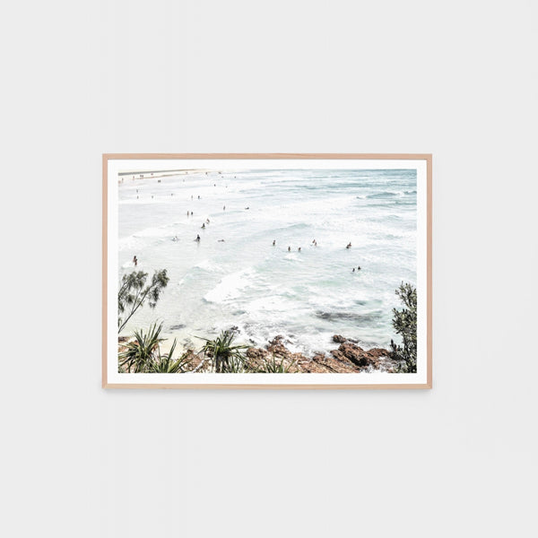 A stunning coastal photographic print featuring surfers in Byron Bay, New South Wales.