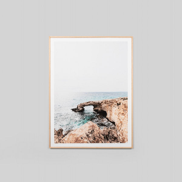 Make a statement in any space with this photographic print featuring a coastal rock formation in Greece.