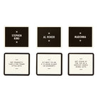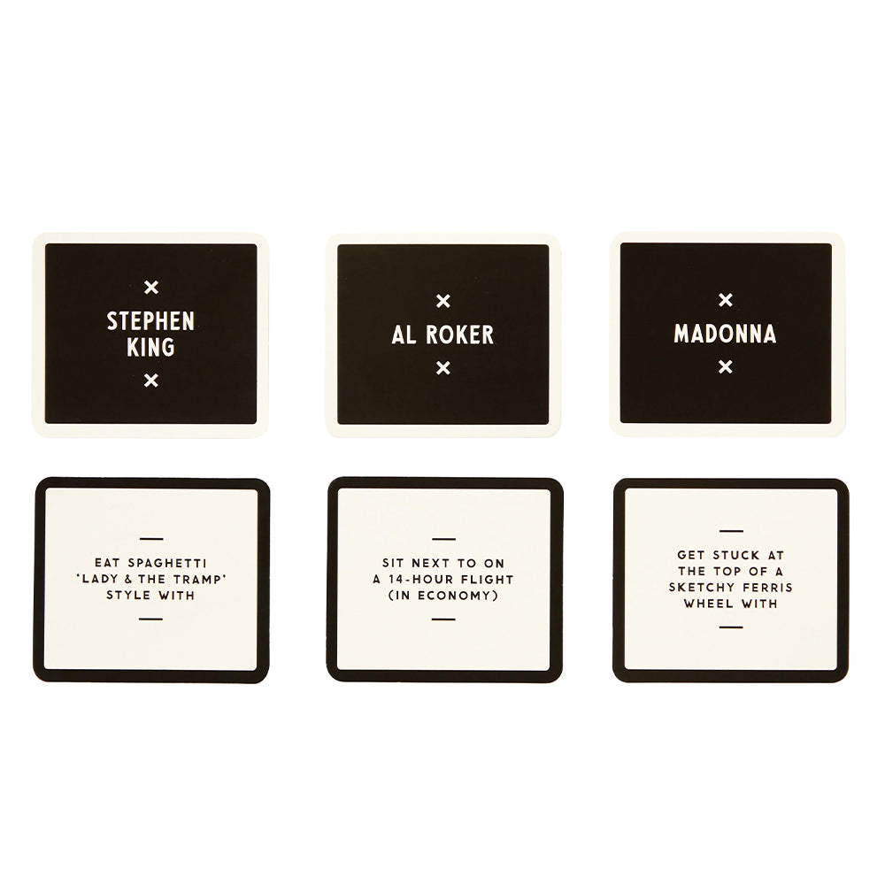 HOW TO PLAY - Players draw 3 random ‘celebrity’ cards and 3 equally random ‘activity’ cards–then full-on debate about which would make the ideal pairings.