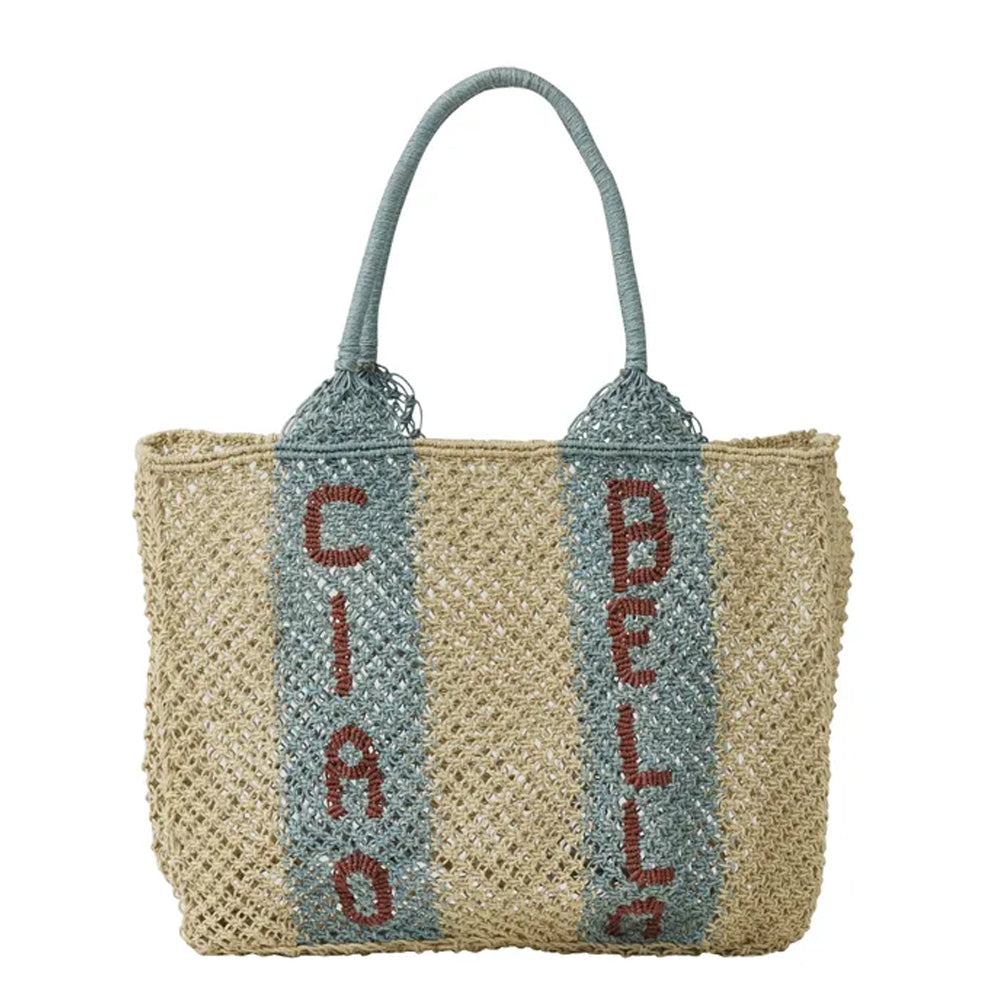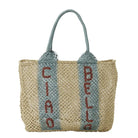 Featuring a blue statement handle and stripe design on a natural jute base, with the words CIAO BELLA in deep red.
