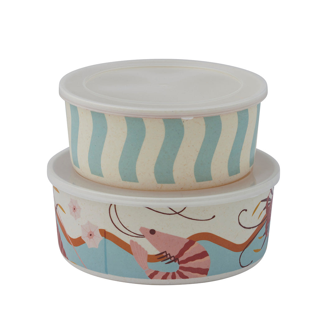 Comprising of a smaller style with a wavy blue stripe design, and the larger with seafood motifs, each container is smooth and matte with a snug fitting lid for secure closure.