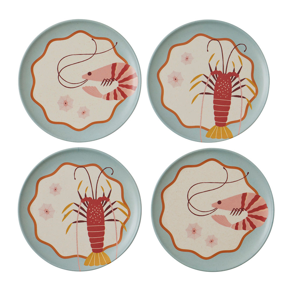 The coastal inspired Set of 4 Bamboo Fibre Plates feature crayfish and prawn motifs, framed by an orange and blue wavy boarder. Perfect for picnics, parties or sunny days by the pool. Ideal for indoor and outdoor use.