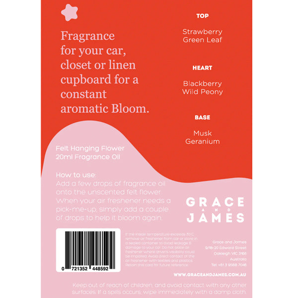 Add a few drops of fragrance oil onto the unscented felt flower, hang and enjoy. When your Bloom needs a pick-me-up, simply add a couple of drops to help it blossom again.