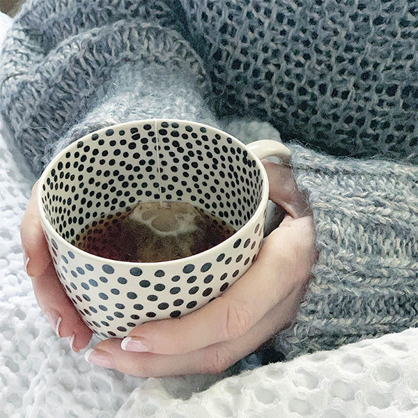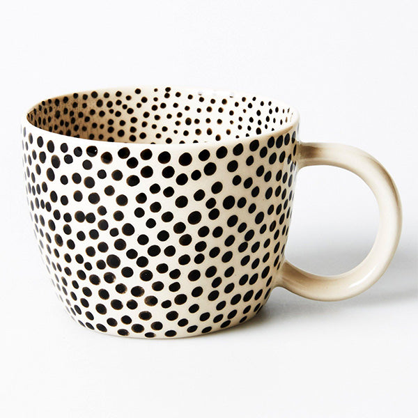 The super cute Jones & Co Chino Mug comes with an intricate hand painted polka dot pattern that is applied to the inside + outside. The delicate style & shape suits tea + coffee drinkers alike.