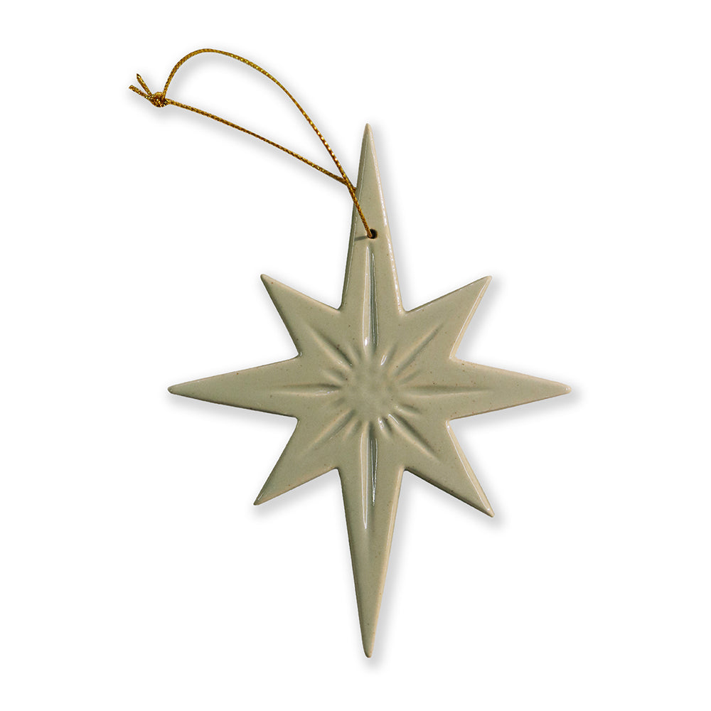 This eight-pointed Star Hanging Decoration features a glossy sage glaze with subtle speckling, etched details and a gold string hanger.
