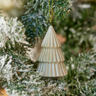 This three tiered Christmas Tree Hanging Decoration features a glossy speckled sage glaze with ribbed detailing, finished with a gold string hanger.