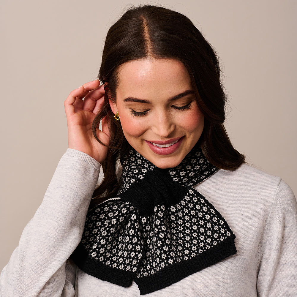 Featuring an open pocket to loop one side of the scarf through the other, keeping it snuggly in place. This compact accessory adds a charming touch to any winter outfit.