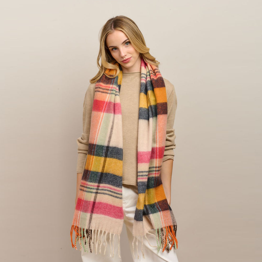 Oversized with long draping tassels, the super soft Yellow Piccadilly Scarf is ideal for casually draping over your shoulders or bundling up around your neck. Its vibrant colour palette of mustard, pinks and mint gives a fresh, playful feel to this classic plaid pattern accessory.