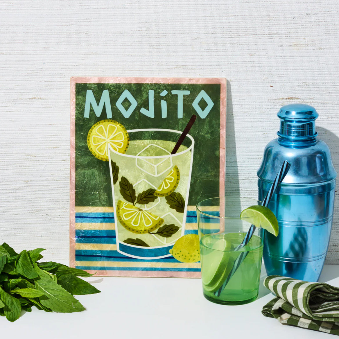 Fresh, fizzy and full of minty goodness. Our Mojito Wall Tile is a nod to your favourite summer sip, complete with lime wheels, mint sprigs and striped retro vibes. Handpainted on capiz shell with that signature mother of pearl shimmer of ours.