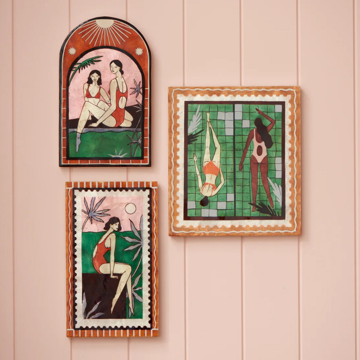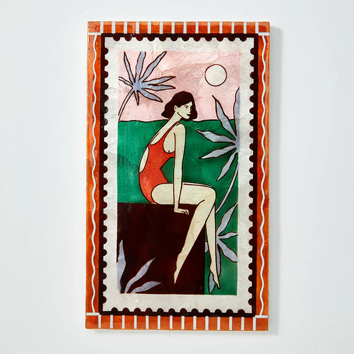 Introducing Jones + Co's Resort Wall Art series, where swimsuit clad women bask in the shimmering ambiance of a glamorous hotel pool. Dangle shows a relaxed resort-dweller dangling her legs over the edge, surrounded by palms and a stamp-like border, in a palette of pink, green, red and soft blue.