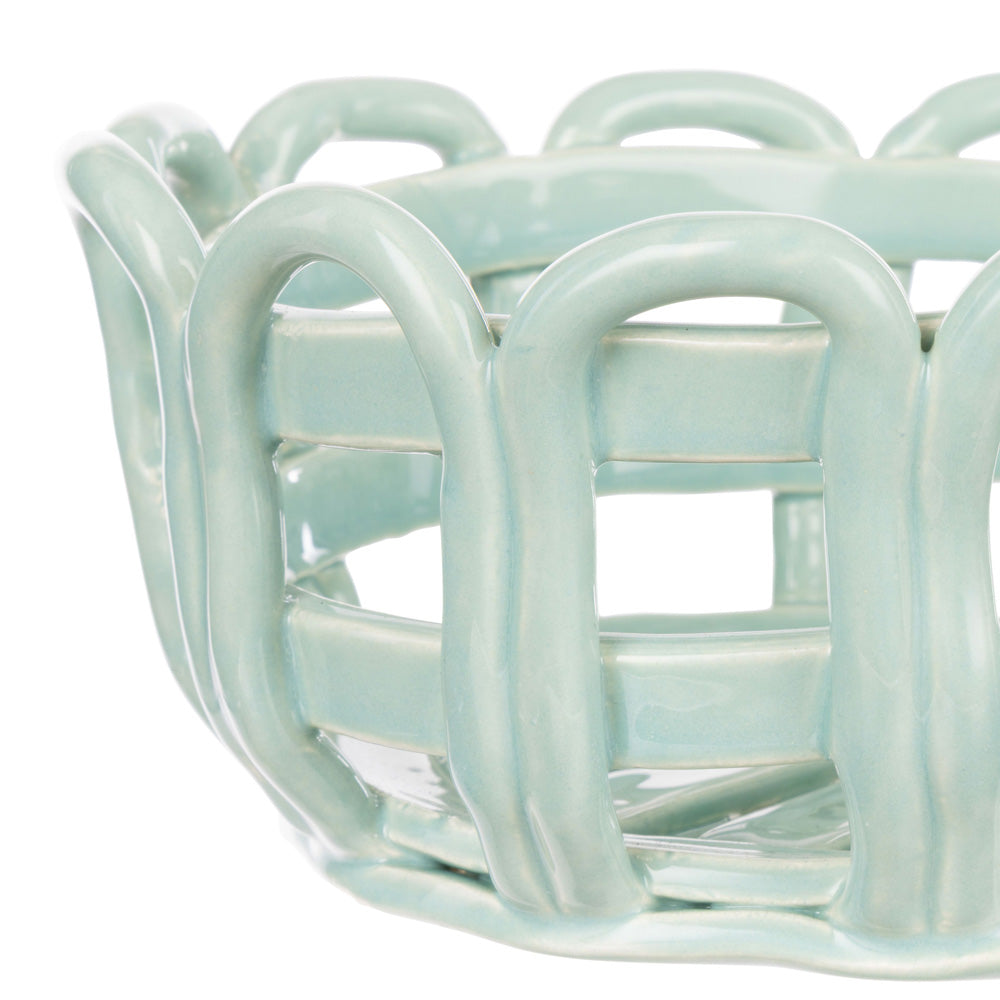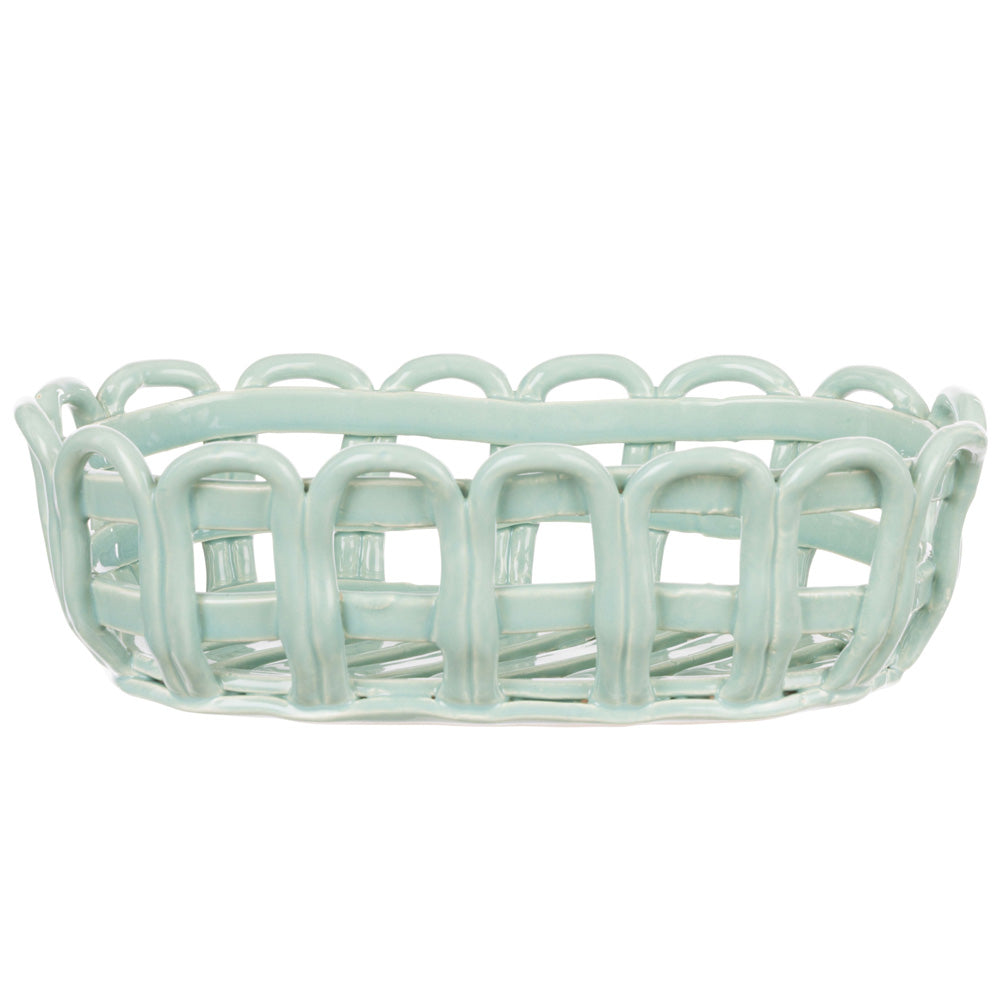 The Rye Oblong Basket is made from durable ceramic, woven to create a basket-like bowl, featuring a green peppermint glaze for a pop of colour.