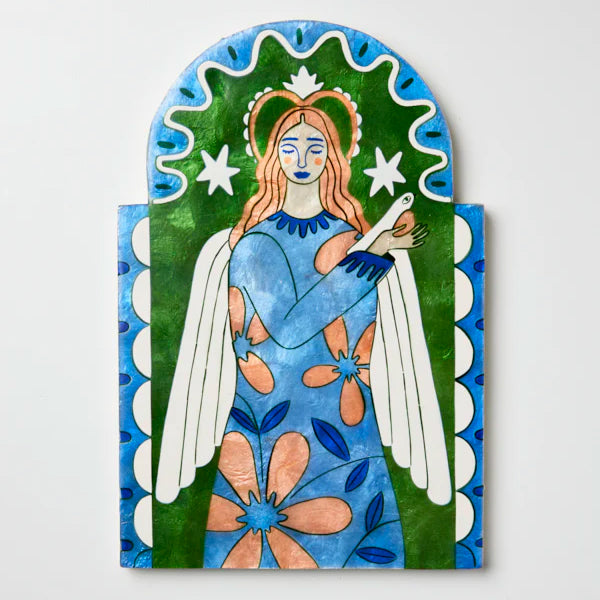 Add a touch of serenity to your space with this charming Gardienne Angel Green Wall Art Tile featuring a peaceful guardian angel holding a dove in a beautiful folk style.