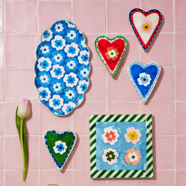 These heart-shaped tiles are handcrafted from lustrous capiz shells with a delicate poppy bloom and wavy filigree edge hand-painted in a rainbow of cheery hues. Perfect for accent walls or backsplashes, the artisan-made Poppy tiles celebrate blossoming nostalgia and colour with their natural materials and whimsical heart designs.