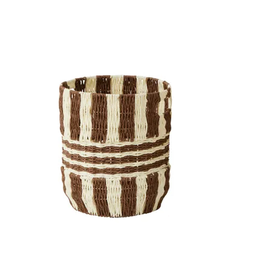 Rattan baskets are ideal for adding colour and texture into any space. The Solana Basket features thick chocolate brown and cream stripes running vertically, broken up by thinner stripes running horizontally, and open handles.