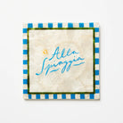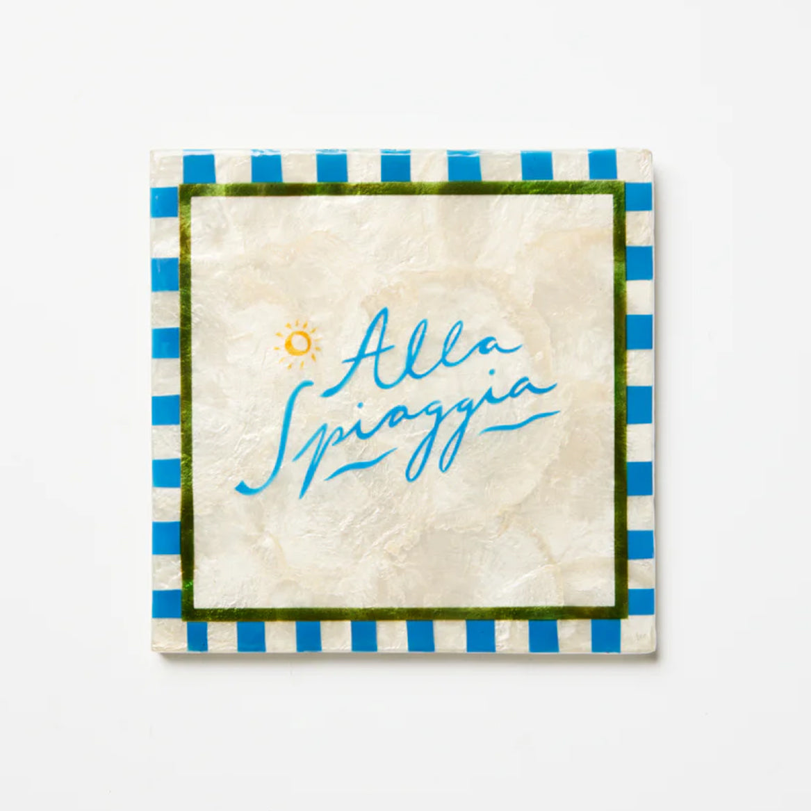 Sun, salt and stripes. The Superette Alla Wall Tile is a holiday postcard, hand-painted on capiz shell with a buttery yellow wash and blue border. "Alla Spiaggia" - to the beach!