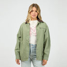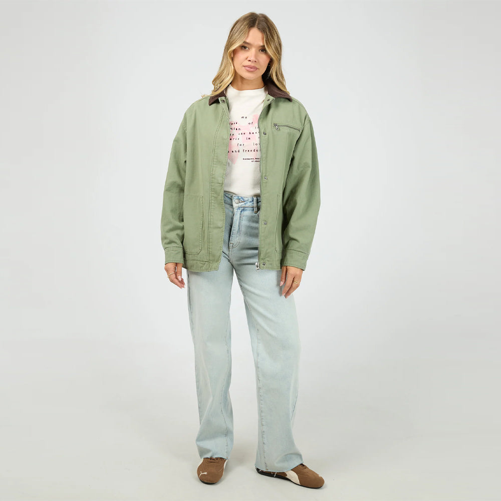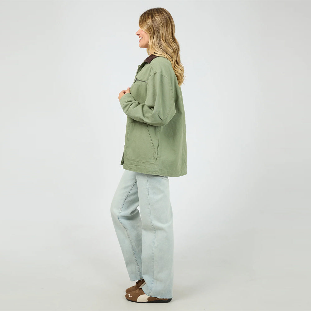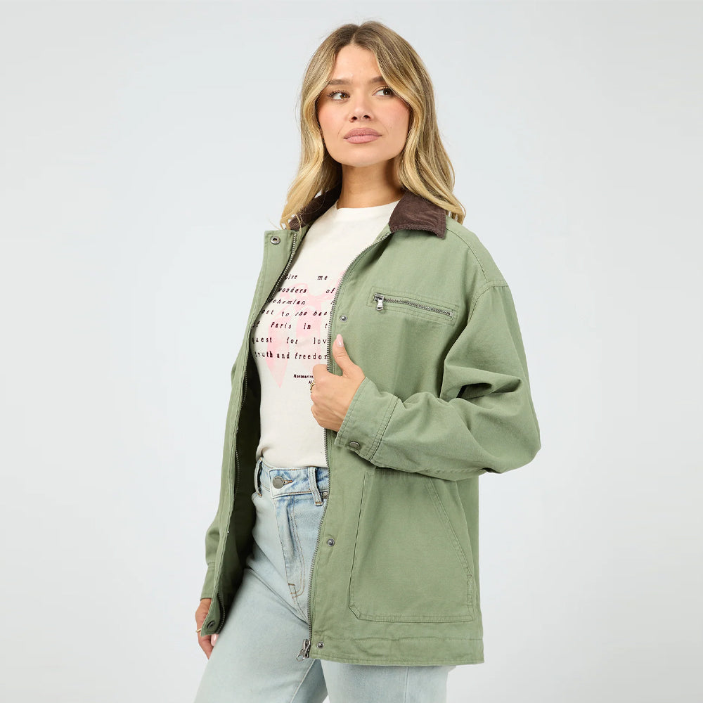 The Sutherland Jacket (All About Eve Clothing) in khaki offers a relaxed fit for comfortable all-day wear. Crafted from 100% cotton, it features a collared neckline and multiple pockets for practical style. The zip-up front closure and button-up cuffs add functional details, making this jacket a versatile and reliable choice for your wardrobe.