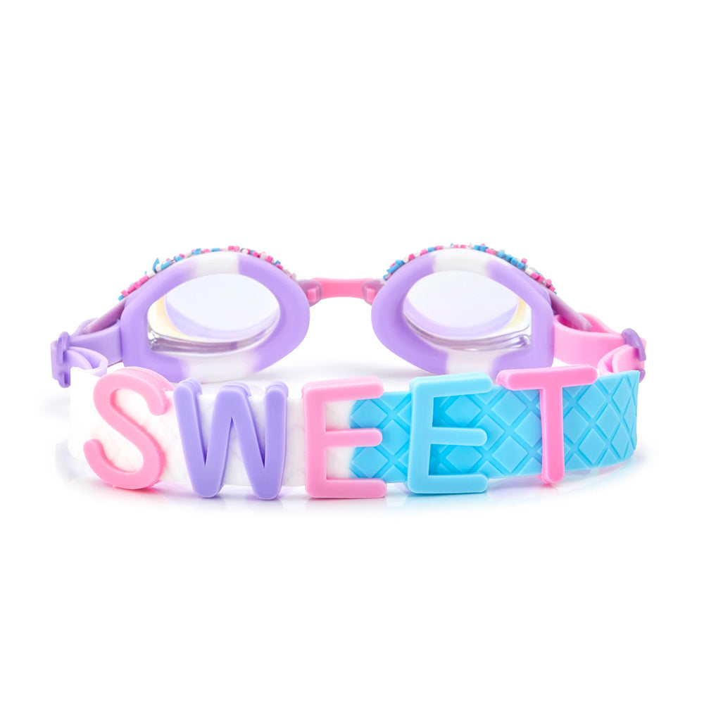 Funfetti will have you looking sweet as sprinkles. Non-Pareils Purple is a traditional framed swim goggle coated in purple colored sprinkles, with a waffle cone printed strap. And if that isn’t sweet enough, we have you covered with silicone sliders spelling out S W E E T.