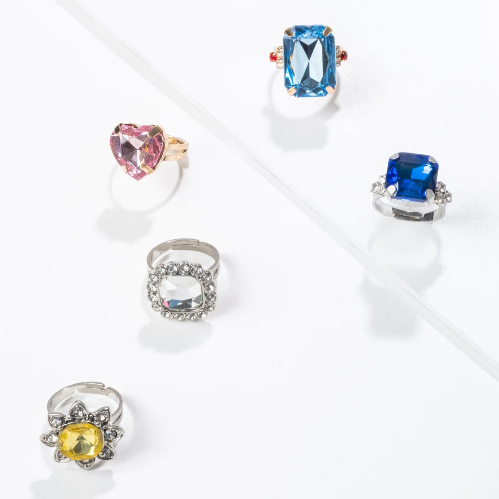 - Set includes: 5x Rings with colorful, oversized gemstones