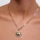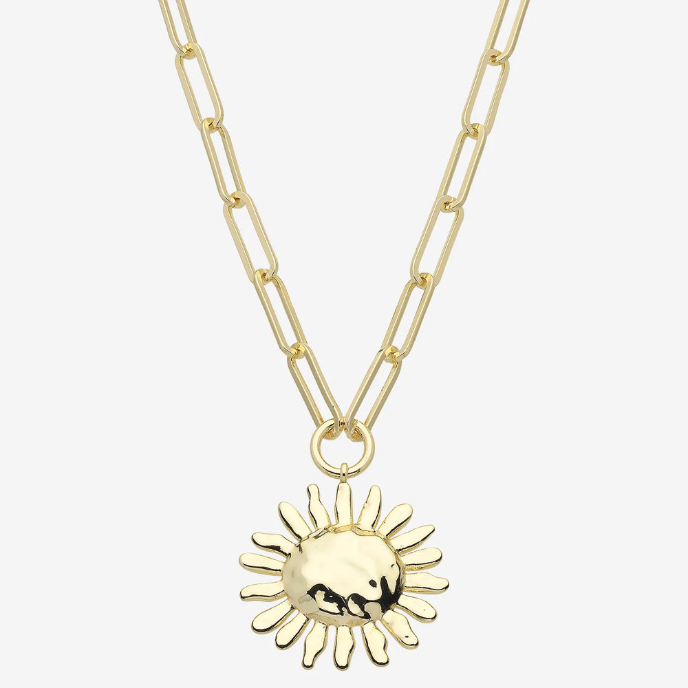 The Summer Gold Sun Necklace features a modern, textured sun motif on a large paperclip chain. For the bohemians at heart.