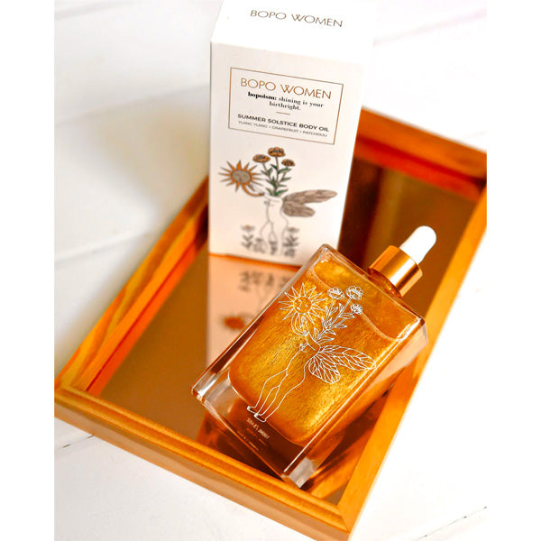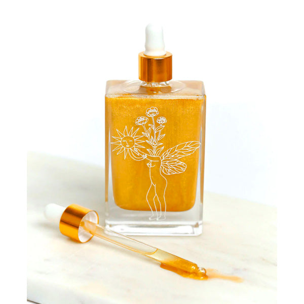 Our Summer Solstice Body Oil is an all natural shimmer oil with a delicate floral perfume thanks to the beautiful Ylang Ylang, Grapefruit, Mandarin & Sweet Orange. Deeply hydrates skin while leaving a light sun-kissed glow and works well with all skin types. Can also be used in the bath. Make sure to regularly shake this product before use to get the most out of it’s glittery magic. P.s. If you like our Aphrodite perfume roller you’ll love this oil as it’s the same scent!