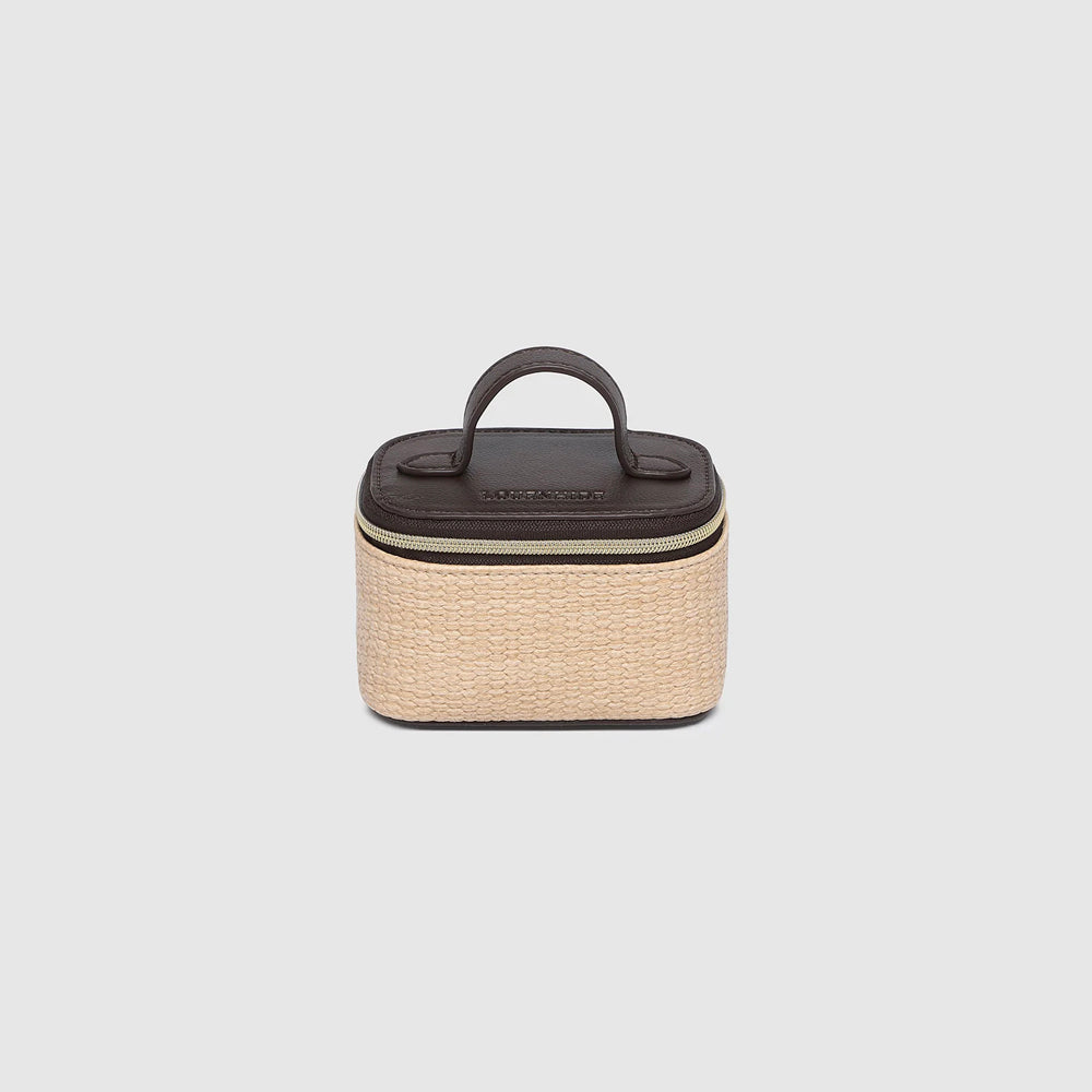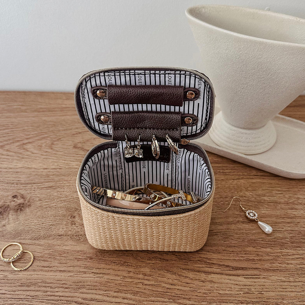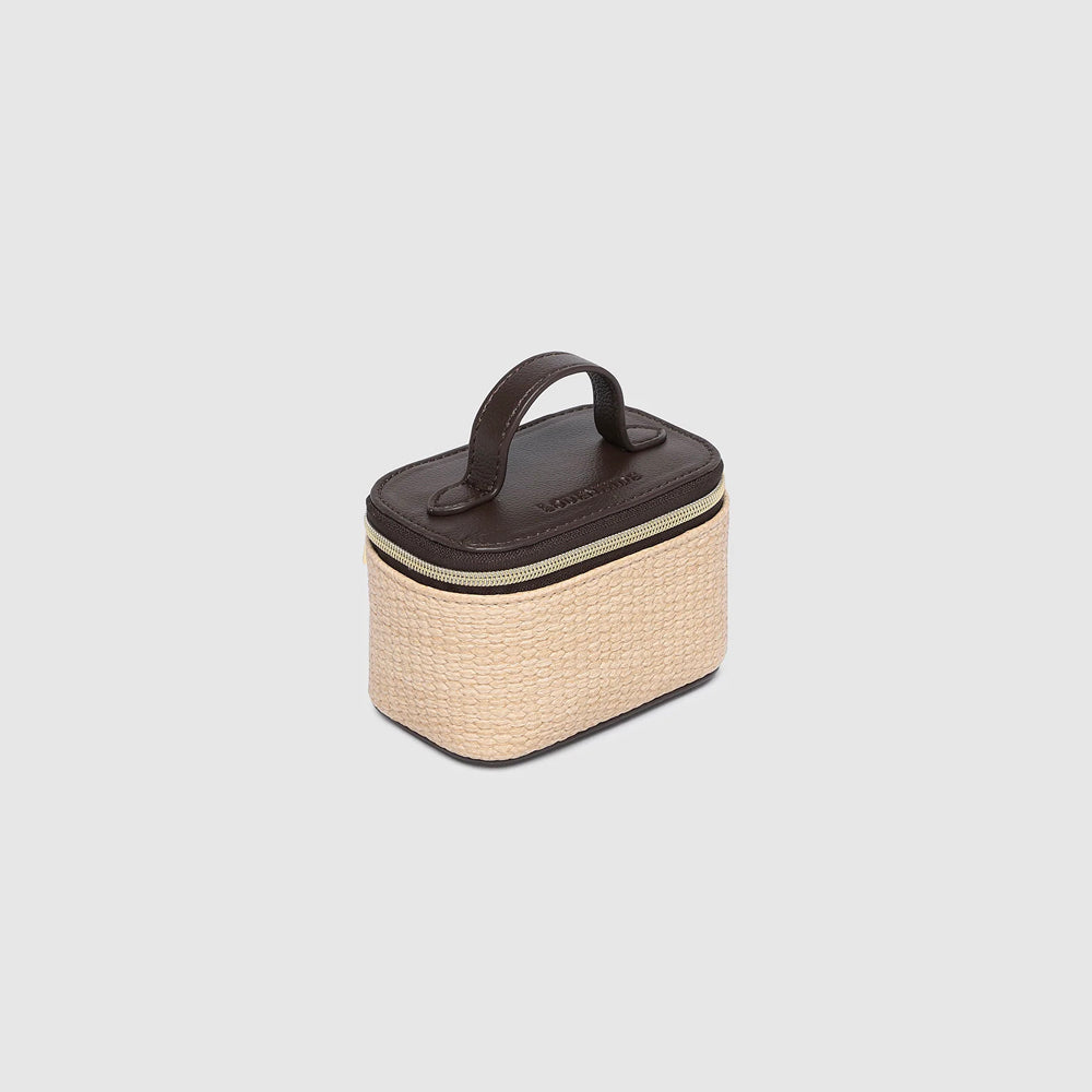 This compact travel jewellery case fits seamlessly into your luggage without taking up space. The secure zip closure ensures your jewellery stays protected, while the textured raffia and contrasting faux leather exterior add a touch of understated luxury to your travel style.