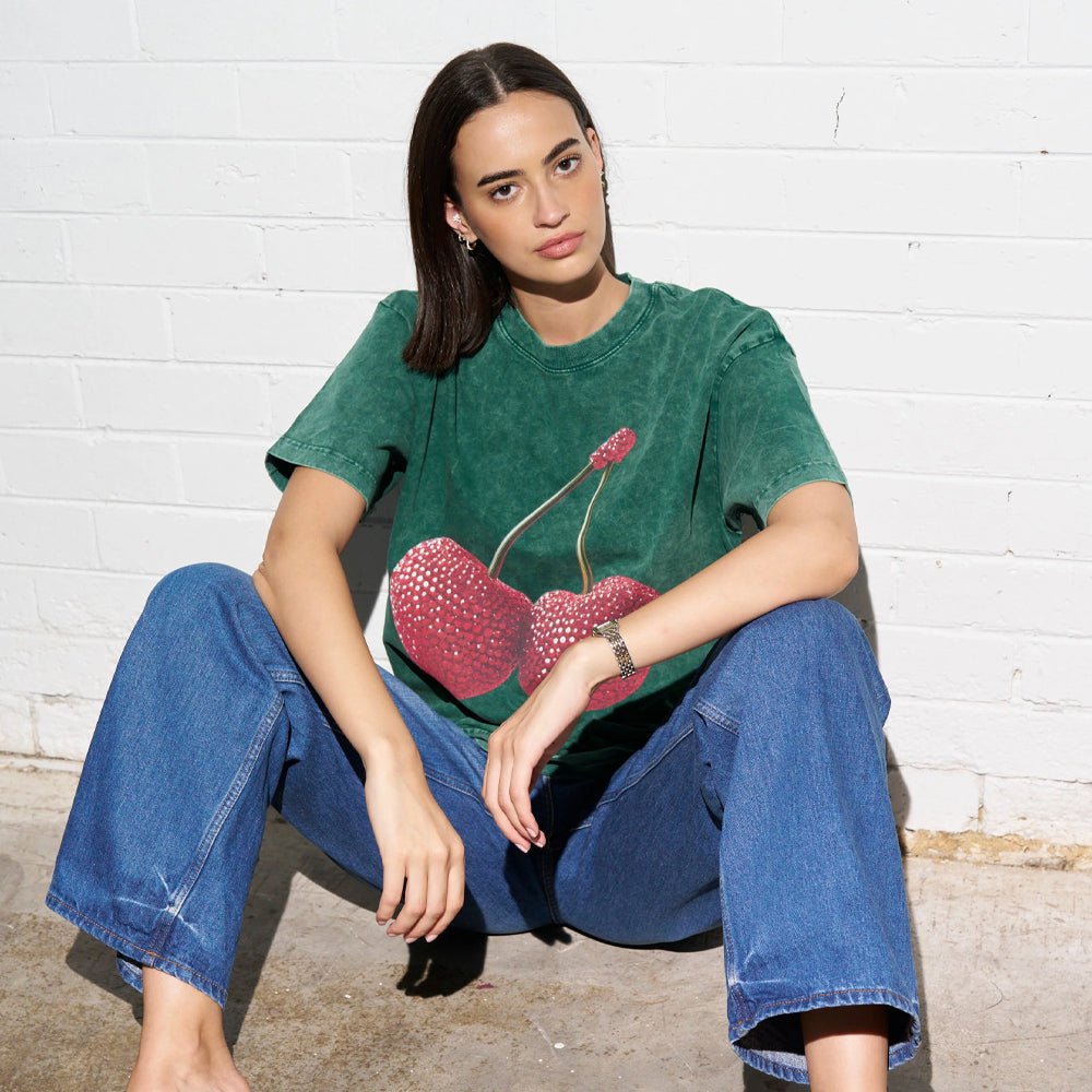 Cherry Baby Acid Wash Oversized Tee (MAKU The Label) is a cult-favourite, crafted from 100% thick cotton, designed to last while offering a buttery-soft hand feel. We recommend choosing your normal size for the perfect fit.