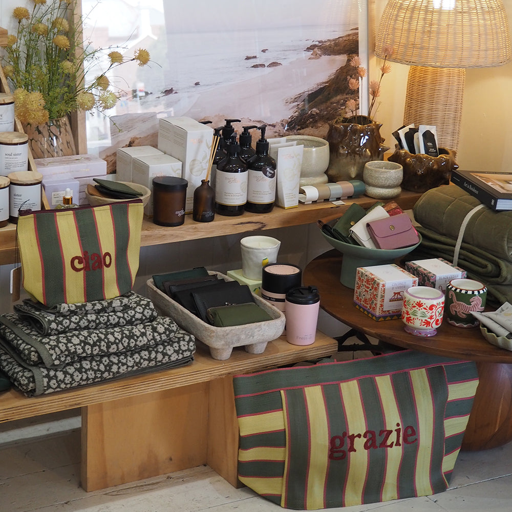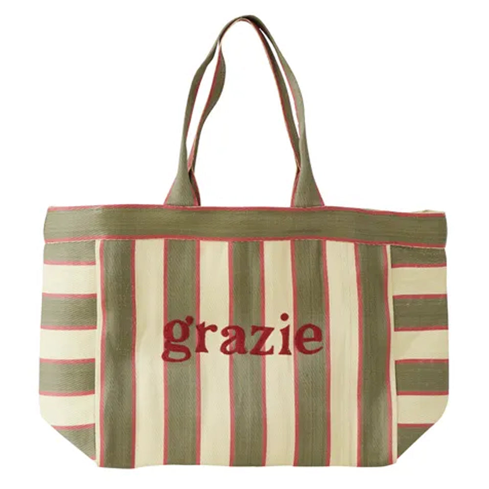 Featuring an olive stripe design with a deep red "grazie" printed on the side for a punch of personality. Thank us later.