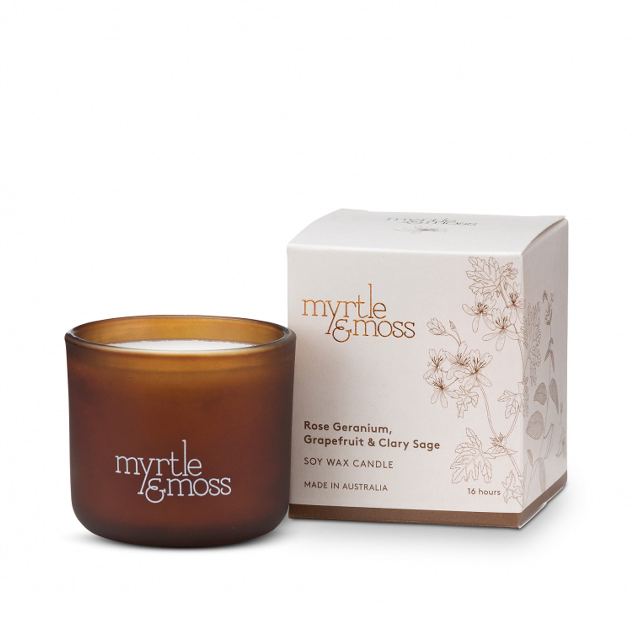 Scented with crisp and vibrant pure essentials oils, this Mini glass Rose Geranium, Grapefruit and Clary Sage pure soy wax candle will burn for 16 hours.