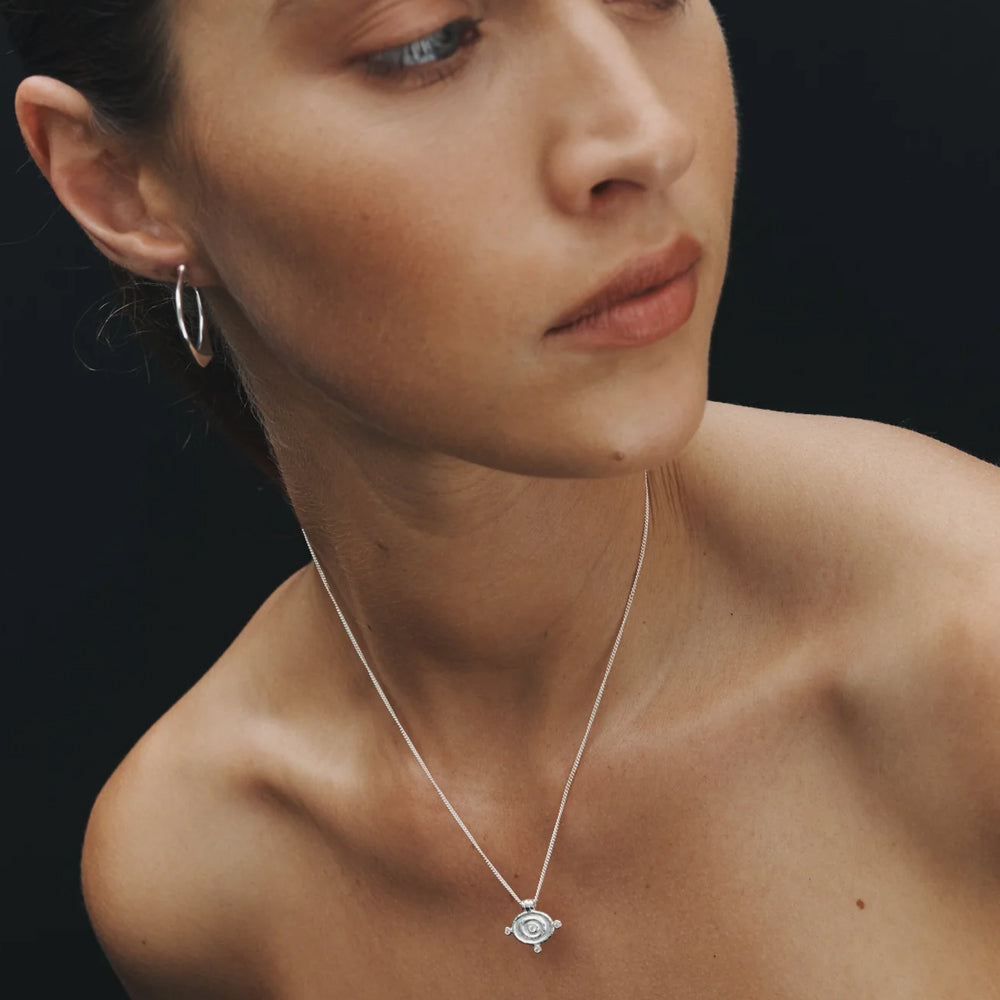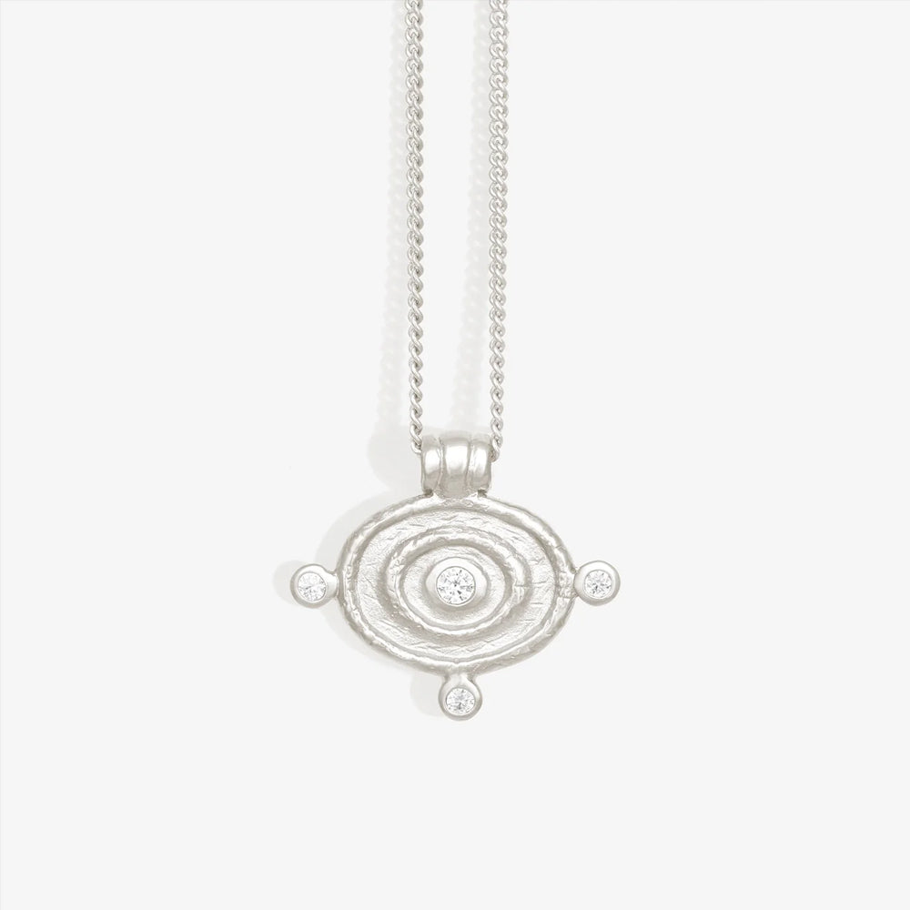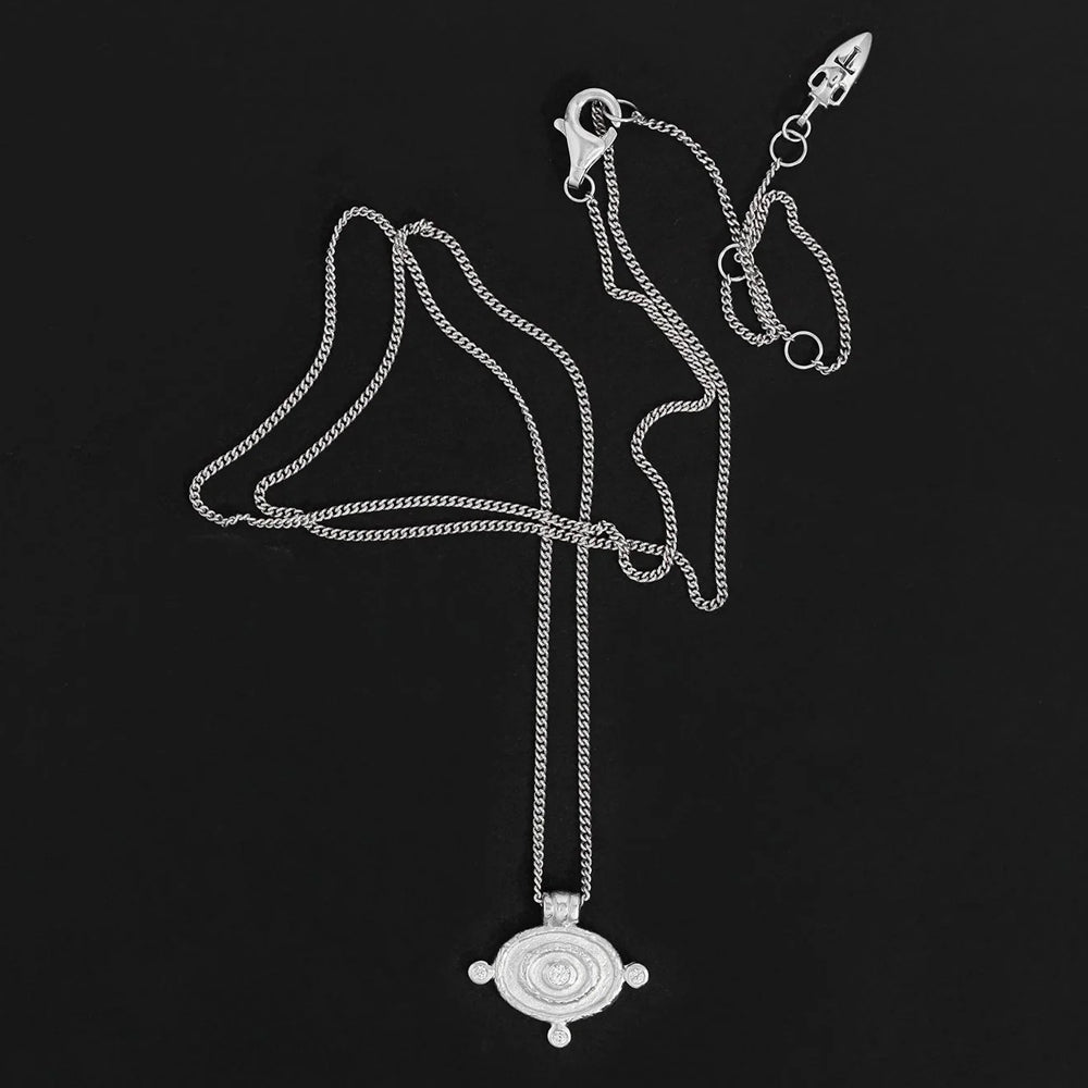 Handcrafted in recycled sterling silver, the Reign Oval Necklace features a single textured oval medallion set with natural zircon, suspended from a fine curb chain.