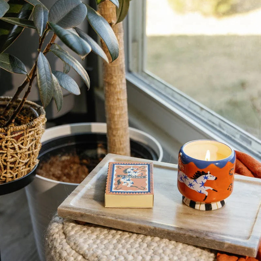 Housed in an interesting, reusable ceramic vessel with a striking painted horse motif, the Apodo Candle is beautifully boxed and perfect for gifting someone with a unique sense of style.