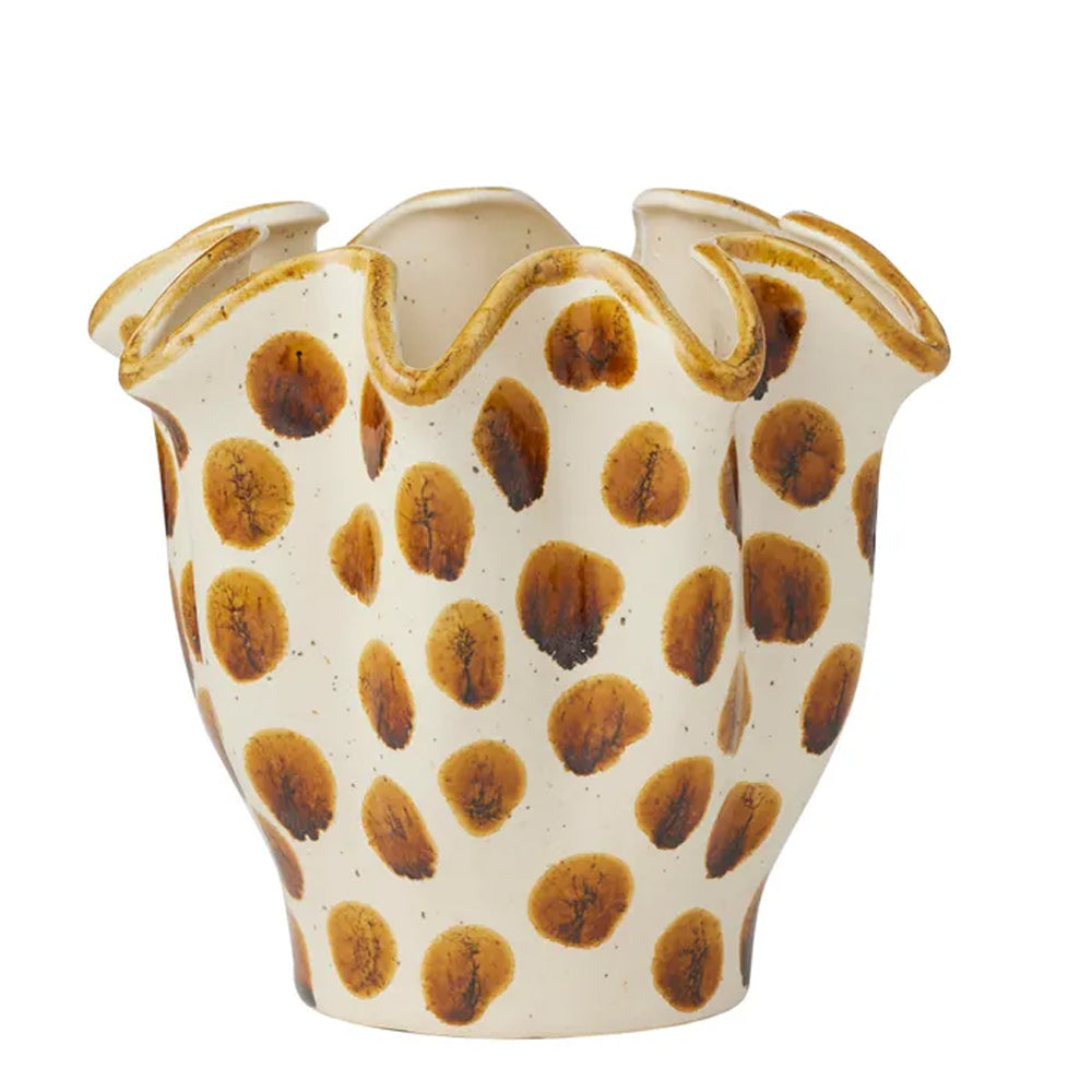 Playfully over-the-top, the Brun Ceramic Pot is dramatic and different. Featuring painterly brown spots on a speckled ivory base, a slightly gathered silhouette and exaggerated pleated rim with brown trim.