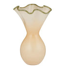 The buttery peachy tone of the glass body is accented by an olive green edge along the rim.