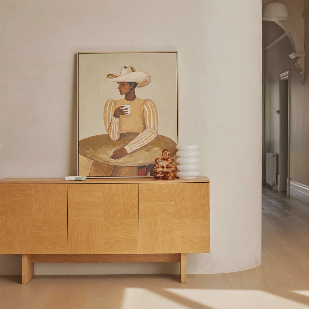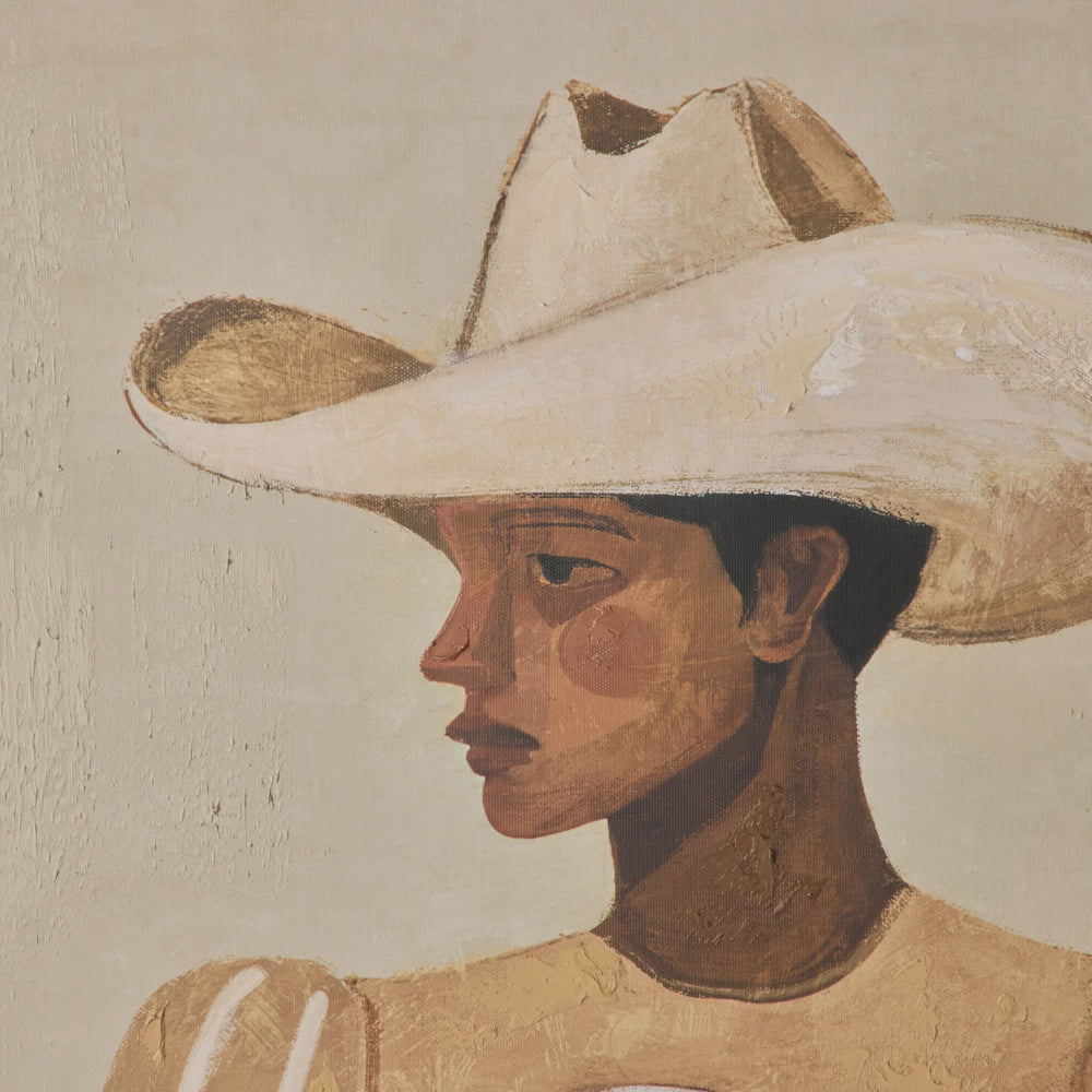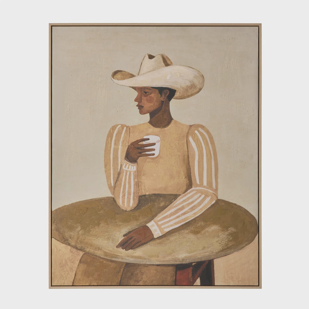 Desert Stillness evokes a sense of quiet calm to your space - its desert palette of mustard and browns warm and inviting. It depicts a lone figure wearing a cowboy hat, sitting at a table with a drink in hand.