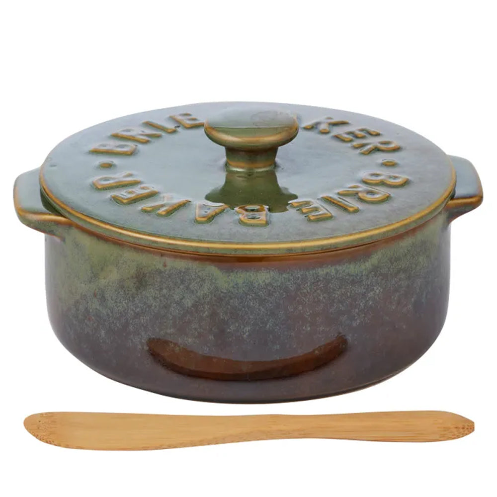 The Loire Brie Baker is cheese lovers and platter people. This farmhouse style ceramic dish, with ombre olive glaze and stamped lid, allows you to easily heat, transport and enjoy all the gooey goodness of baked bries and camemberts whilst containing the melted mess.