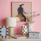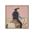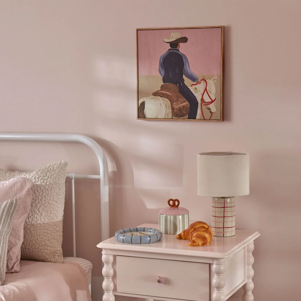 Find yourself in the Lone Rider. A playful interpretation of the cowboy trend, this light pink and beige canvas with a pop of red brings colour and whimsy to every interior.