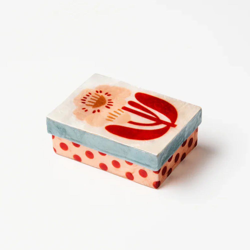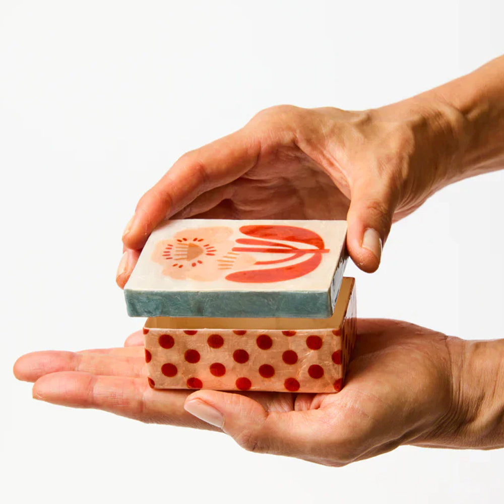 The whimsical Paradis Box offers sweet storage, wrapped in pink polka dots and florals that catch the light beautifully. Hand-crafted in Capiz shell by skilled artisans, each piece transforms everyday organisation into a decorative statement - its natural iridescence ensuring no two pieces are identical.