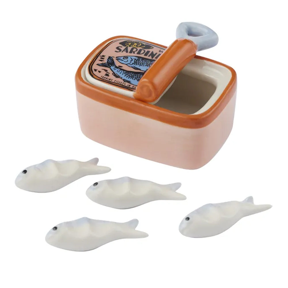 Keep your chopsticks handy and off the table, secured on these playful ceramic fish-shaped chopstick rests. The best part? They come housed in a cermaic box with a lid that looks like a rolled back sardine tin. Enjoy!