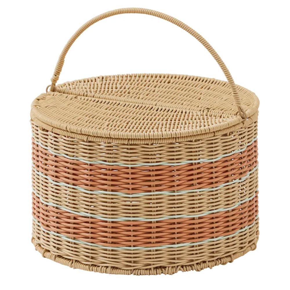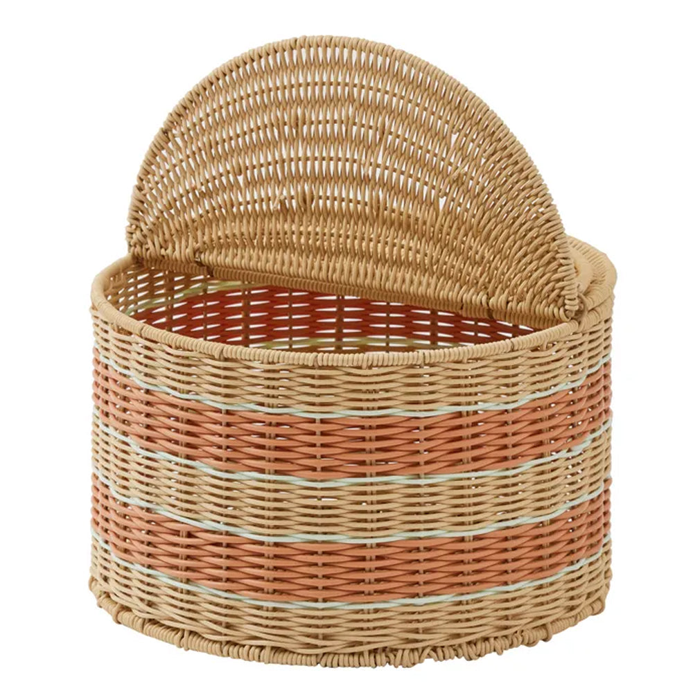 A stylish update on a picnic classic, the Shack Woven Basket features a round woven body wrapped in a striped design, with dual-flap lip opening and handle.