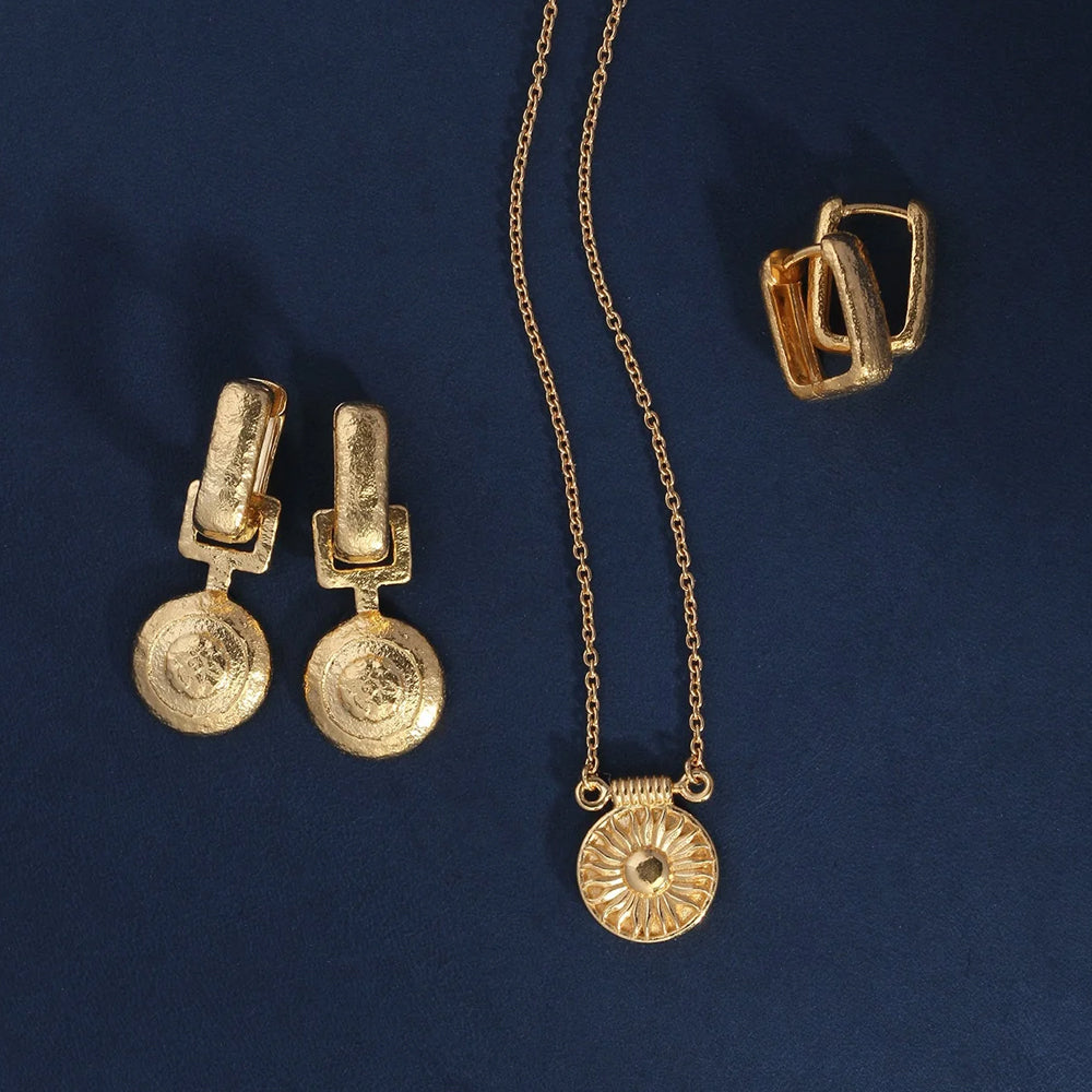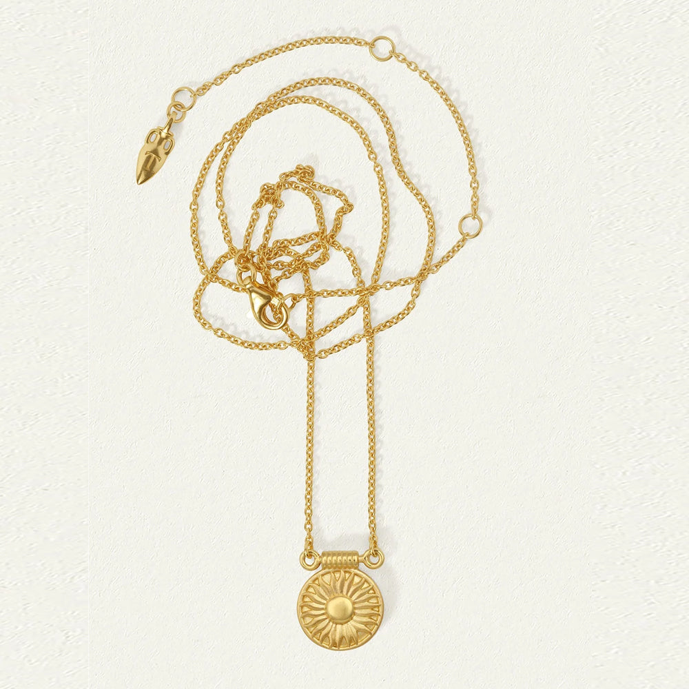 Crafted from 18k gold vermeil, the stunning Sunny Necklace features a sun pendant suspended from a cable chain. The radiating sun motif is an archetypal symbol representing life, power, and divine energy.