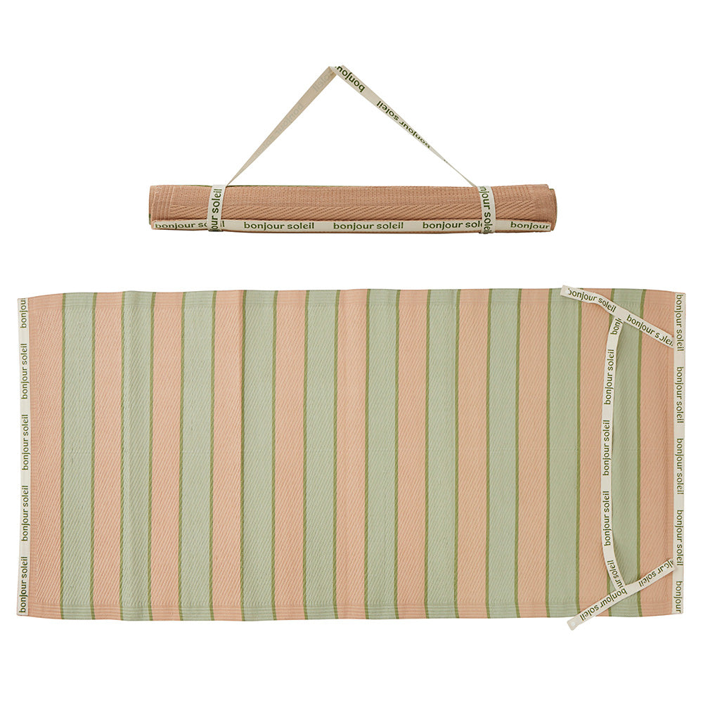 It features a sunset inspired palette of peach and sage stripes, with the words "bonjour soleil" repeating along the trim.