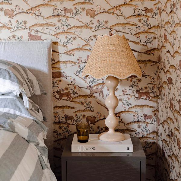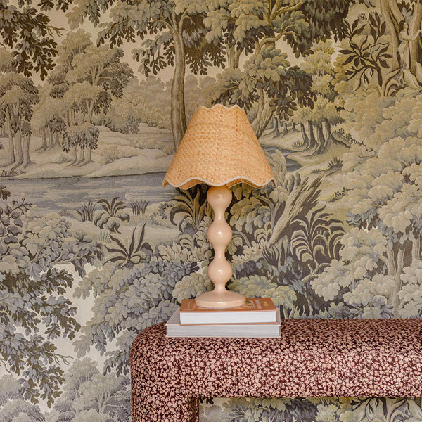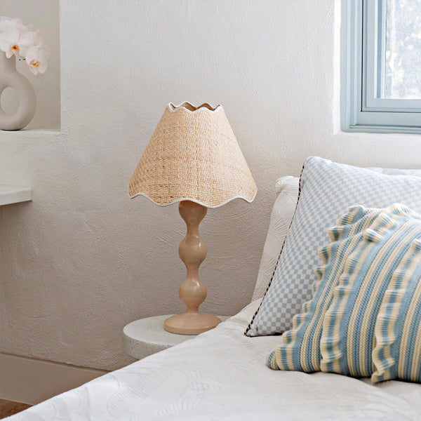 It features a shapely polyresin base in beautifully the neutral Sand colour, and a natural raffia, handcrafted lampshade with scalloped edges that add a delicate touch. The perfect statement lamp for your console, bedside tables, or a special piece to add texture and ambience to a nursery.