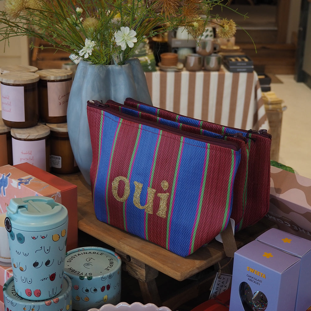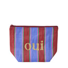 Featuring a punchy blue and burgundy stripe design, with a contrasting stitched "oui" for a pop of personality, this pouch pairs beautifully with our Merci Tote (sold separately).
