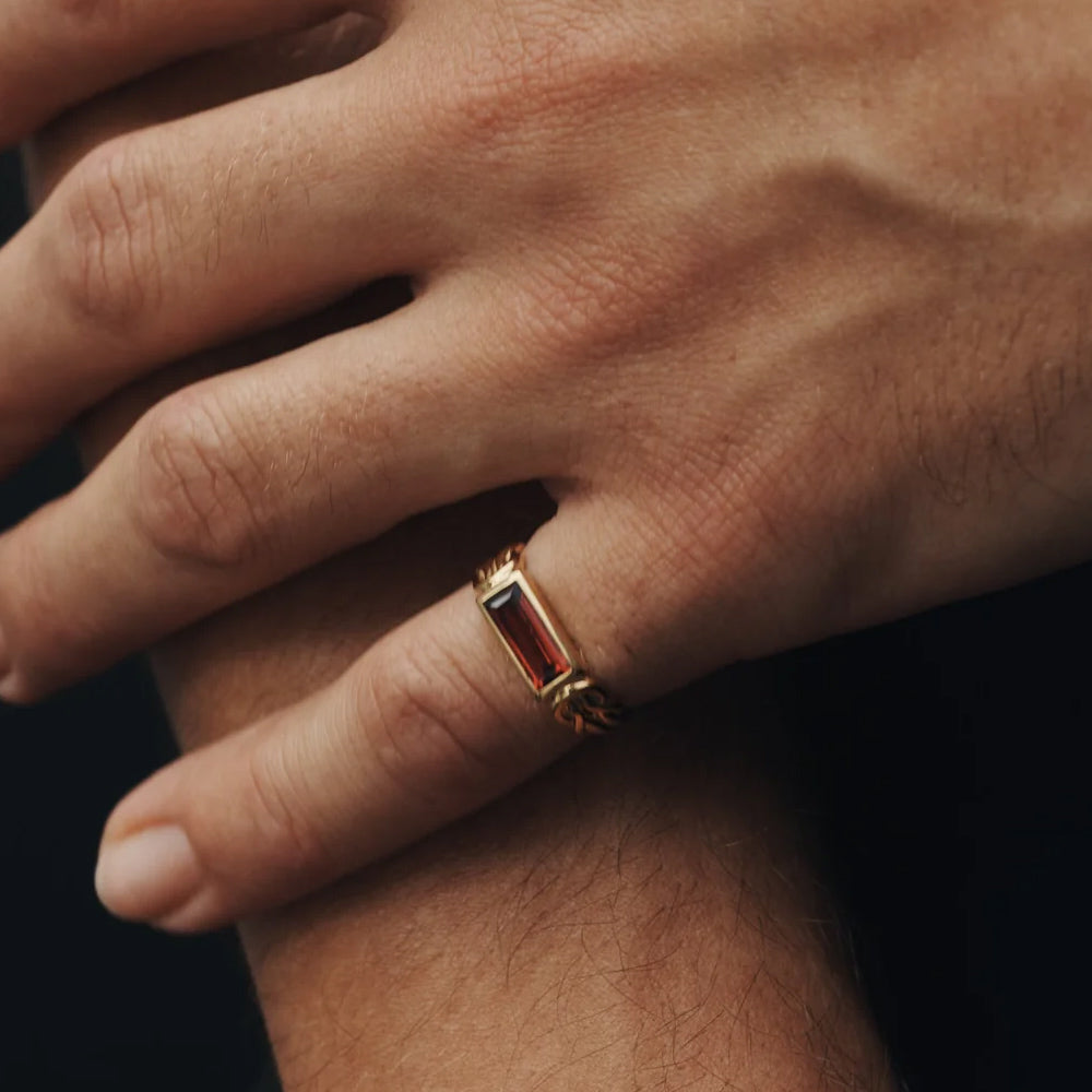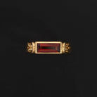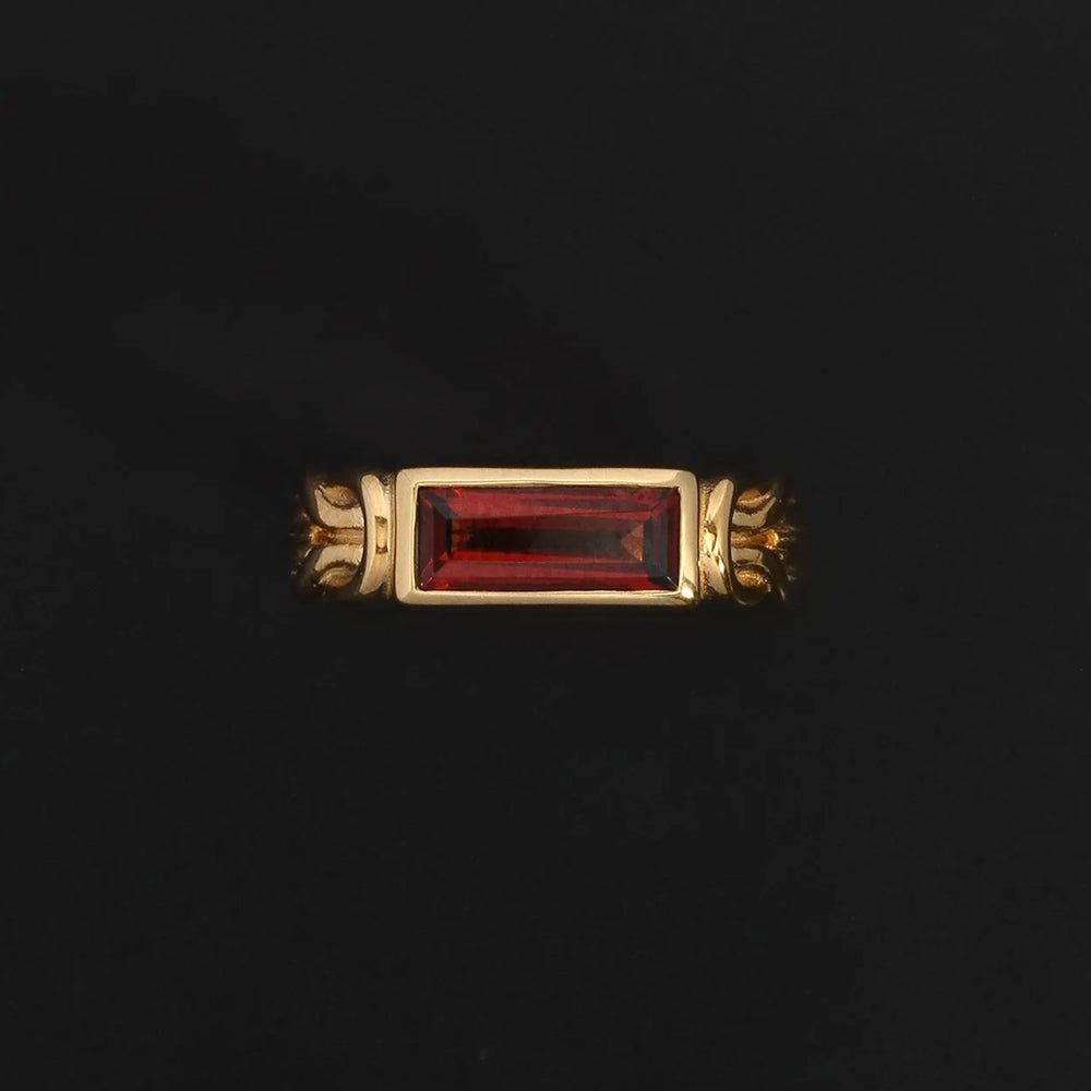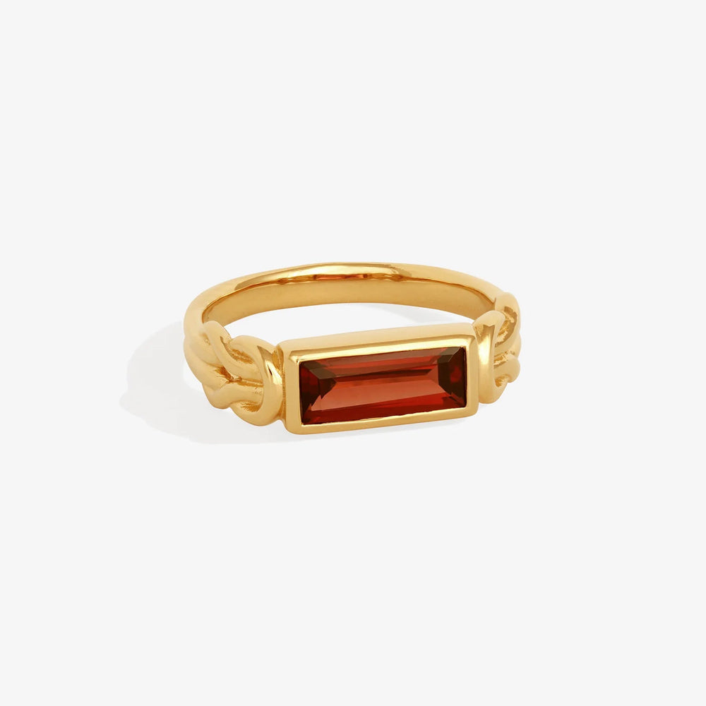 The Airla Ring is a solitaire design featuring an east-west set baguette-cut garnet. The 18k gold vermeil band is formed by two cord-like strands, joined at the shoulders with love knots.