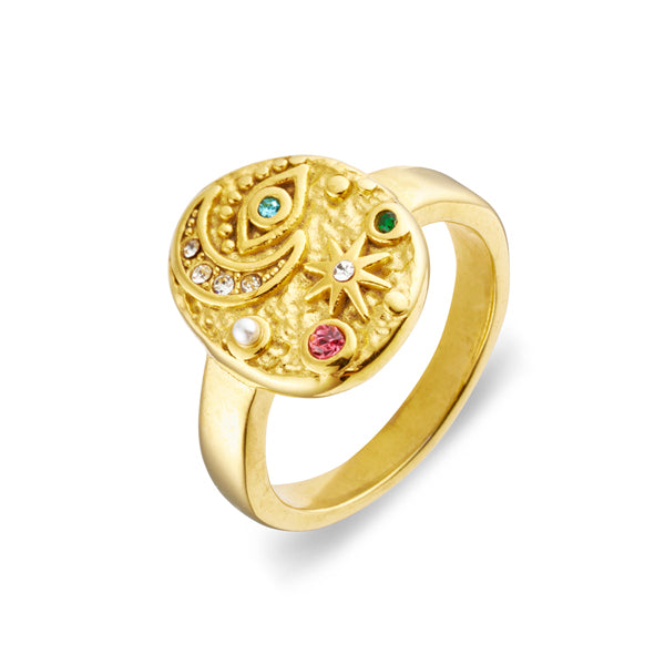 The Celestial Ring depicts a divine cluster of a moon, star and evil eye on a beautifully textured organic-shaped face. Featuring coloured cubic zirconias and a tiny pearl on a gold base.