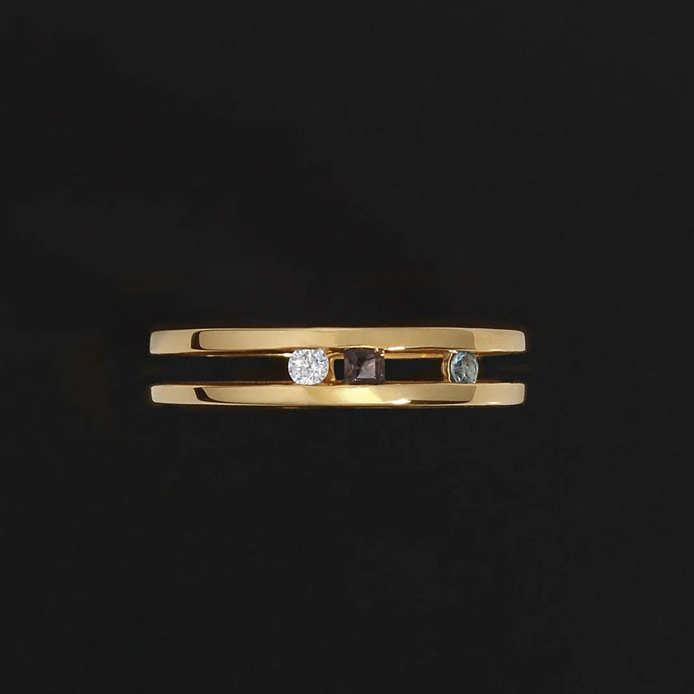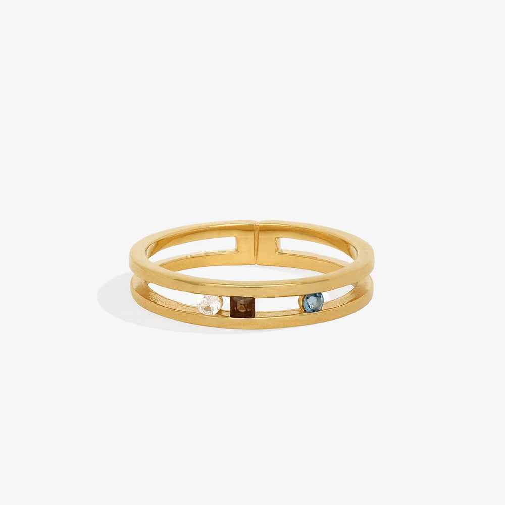 Crafted from 18k gold vermeil, the contemporary Ceto Ring features an open band with channel-set natural zircon, London blue topaz, and smoky quartz.