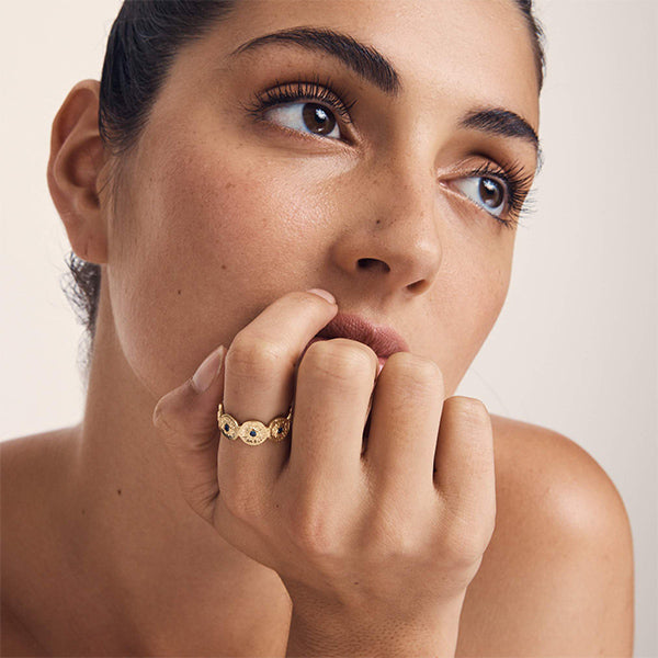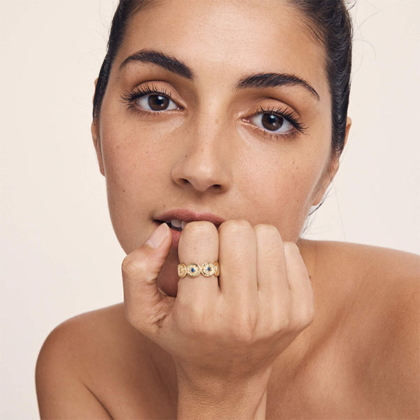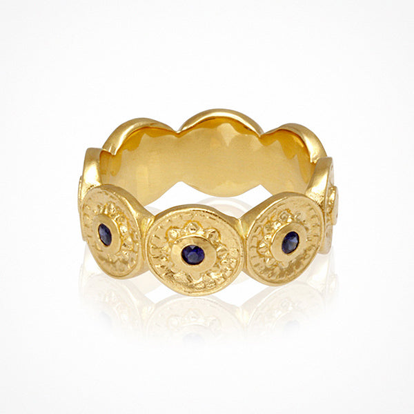 Throughout the ages, the Sun and the Moon have been used as symbols of the masculine and feminine principles as an expression of polarity. They have been mystically represented as deities, or as a Solar King and a Lunar Queen. The Vesta Ring in tumbled 18K Gold Vermeil has three delicate Sapphires that guide us with their wisdom and bring the energy of the Sun and Moon into our daily practices.